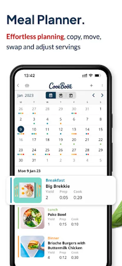 • Plan meals for a day, week, or month with the built‑in meal planner