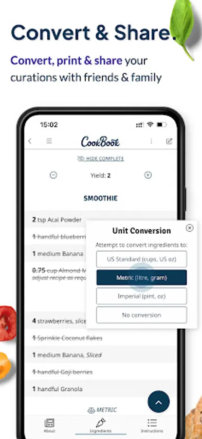 • Effortlessly scale servings and convert units (US, Metric, Imperial, Australian) and temperatures automatically