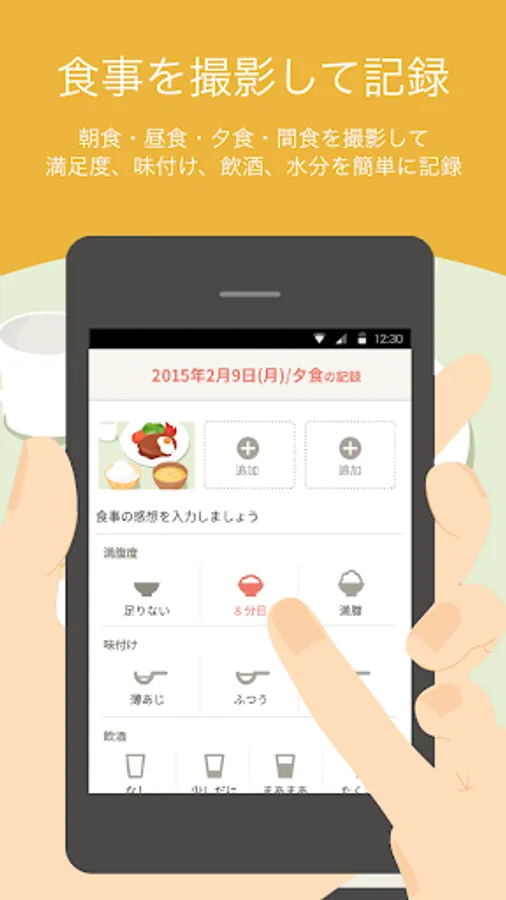食事の際にスマートフォンで写真を撮って、食事の感想を記録できます。