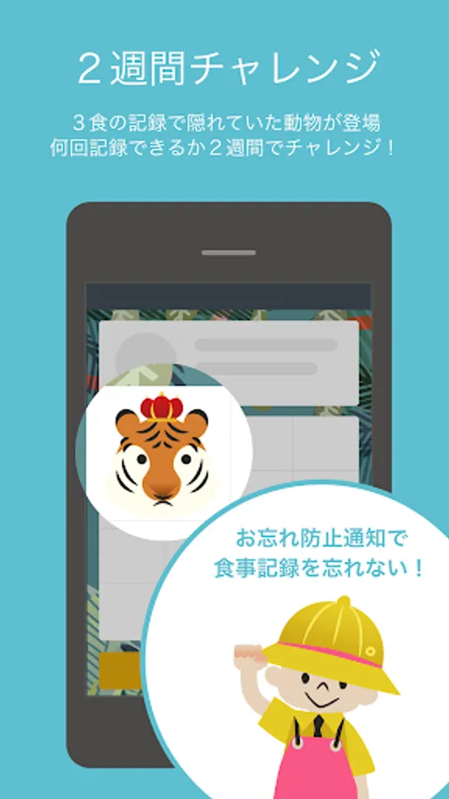 食事記録をするたびに毎日1匹隠れた動物が現れます。2週間続けるとチャレンジ結果とともに見つけた動物がお出迎え?楽しい画面がまっています。