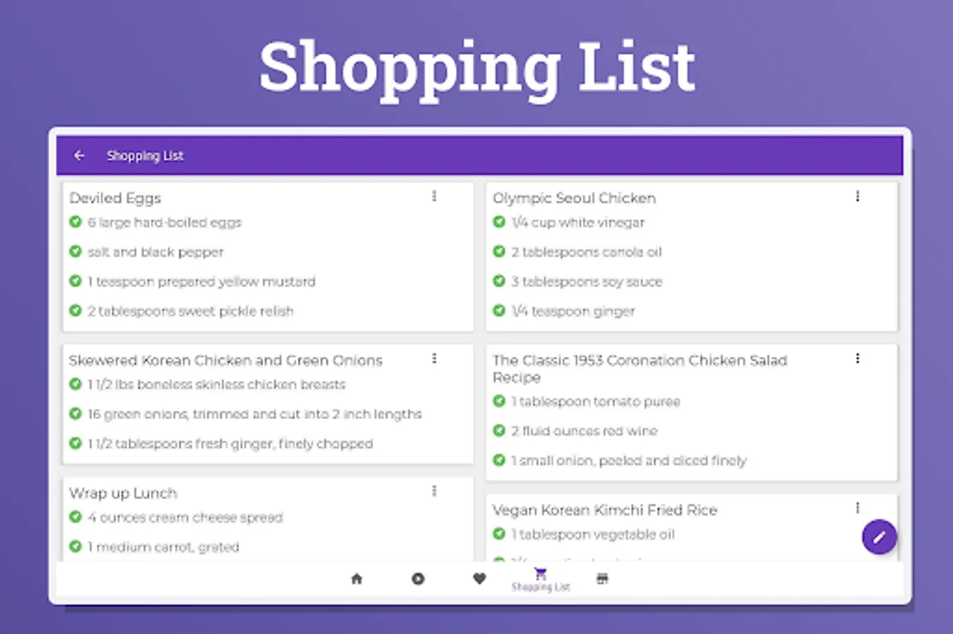 An organized shopping list allows the user to create ingredients list so you won’t miss any for the recipe. Users can also add items directly from recipes.