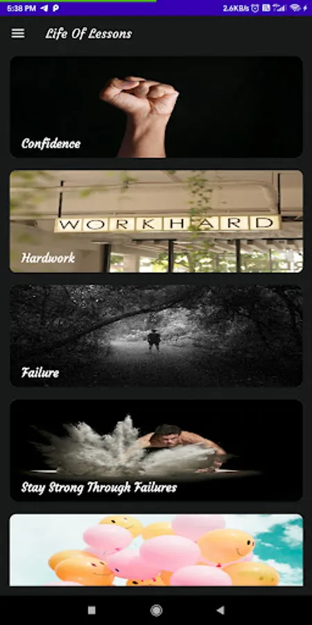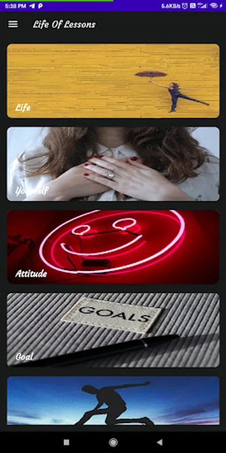 This application provides lessons for life,yourself,attitude,goal,action,confidence,hardwork,failure,staystrongthroughfailures,positive,time,power,accuracy,change,hardtimes,beingreal,keeptrying,encouraging,inspiration,experience,business,sometimes,mistake,forgiveness,happiness,people,fakepeople,giveup,funnyandsmile,presentfuturepast,appreciation,love,shortquotes,wisdom,fitnessandworkout,proverbs.