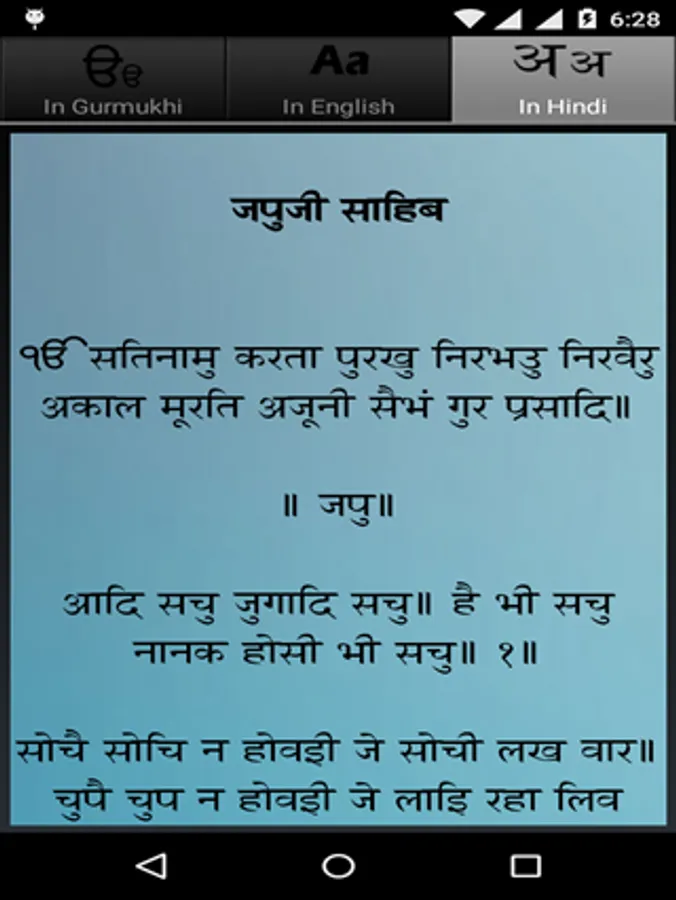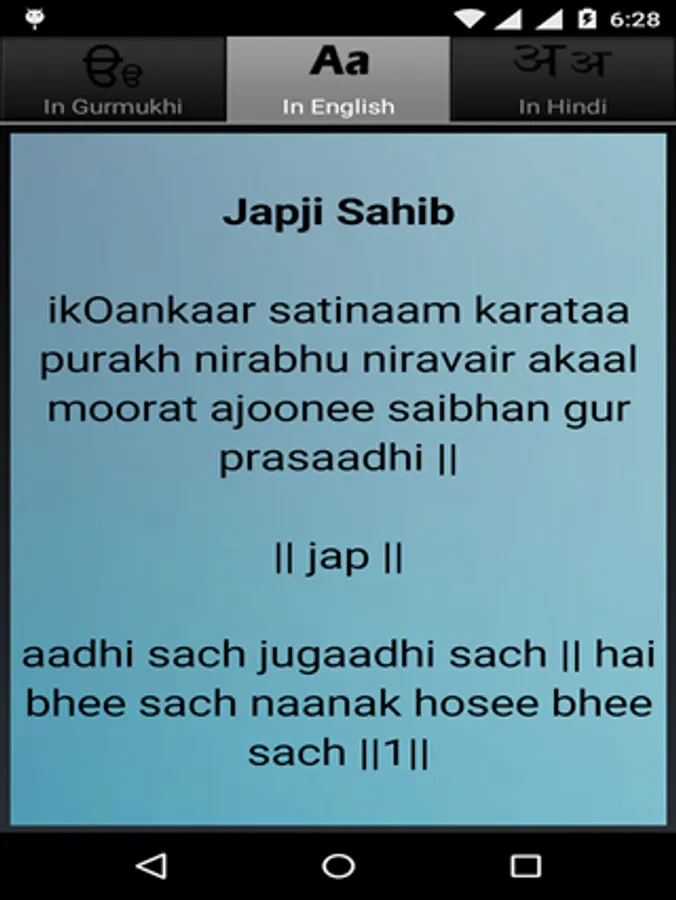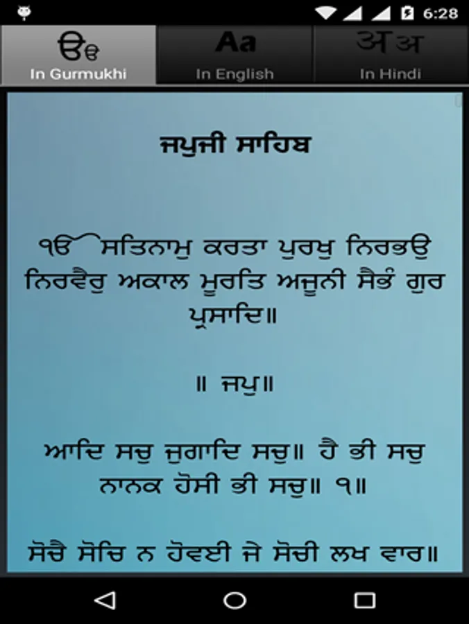 Gurmukhi, English, Hindi & also in audio format with gurmukhi lyrics .