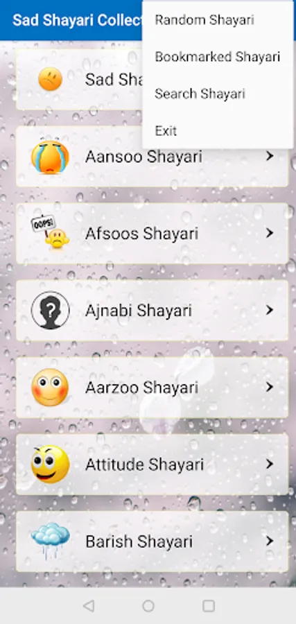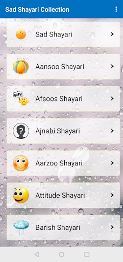 Search your text in data by using a search option available in the menu. In this app, Shayari is divided by categories like Aansoo Shayari, Afsoos Shayari