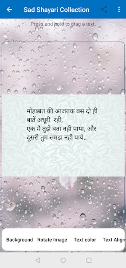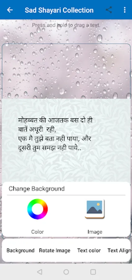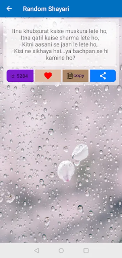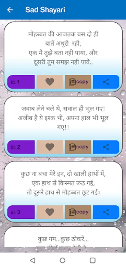 and see in the bookmark section. Share your feelings with a friend and special one by using share and copy option, you can also get a random Shayari in the random section available in menu option