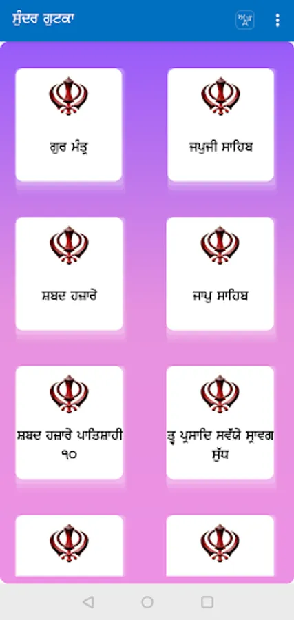 This app includes-gur mantra,Japji Sahib,Shabadh hazaare,Jaap saahib,Shabadh hazaare paatishaahee 10,Tav prasaadhi saavaye sraavag sudh,Tav prasaadhi saavaye dheenan kee,Akaal ustat choupee,Benatee chupee saahib,Ananadh saahib,Laavaa,Aasaa dhee vaar,Raharaas saahib,Aartee,Sohilaa saahib,Aradhaas,Baareh maaha maanjh,Baareh maaha savaiya,Akaal uusatat,Salok mahalaa 9,Sukhamanee saahib,Sukhamanaa saahib,Dhukh bhanjanee saahib and Raag maala.