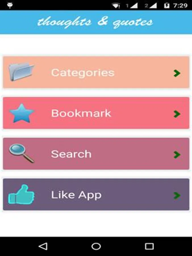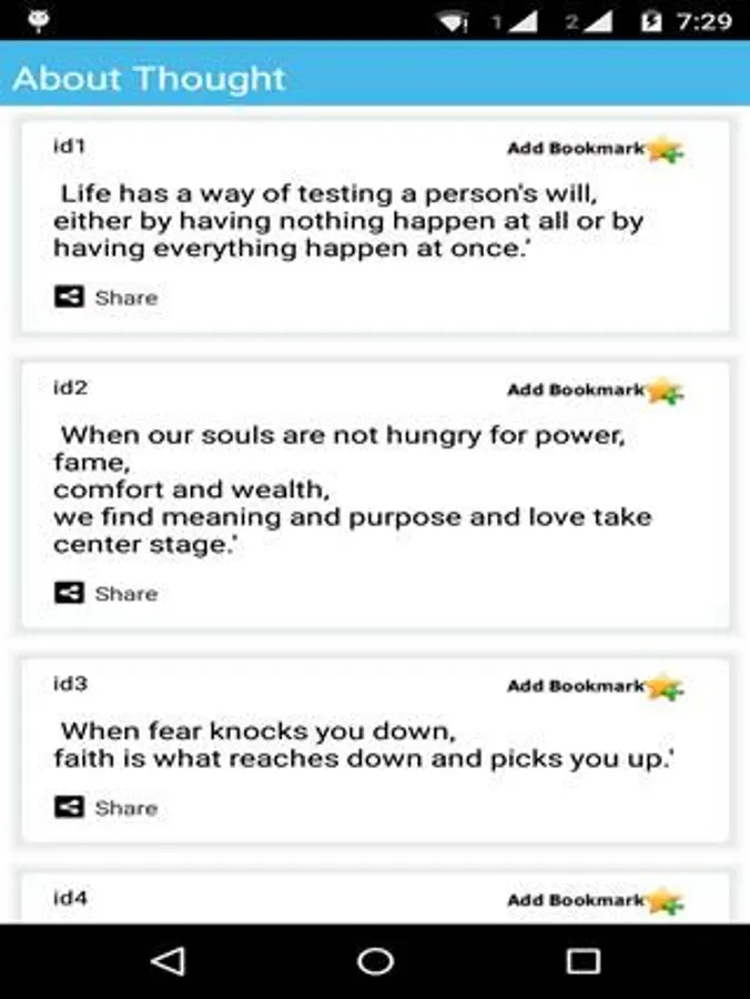 features of the app is:- Thought and Quotes collection. For quick browsing set bookmarks your favourite Thought and Quotes. Share your Thought and Quotes with friend using share option. Search Thought and Quotes using ID & text.