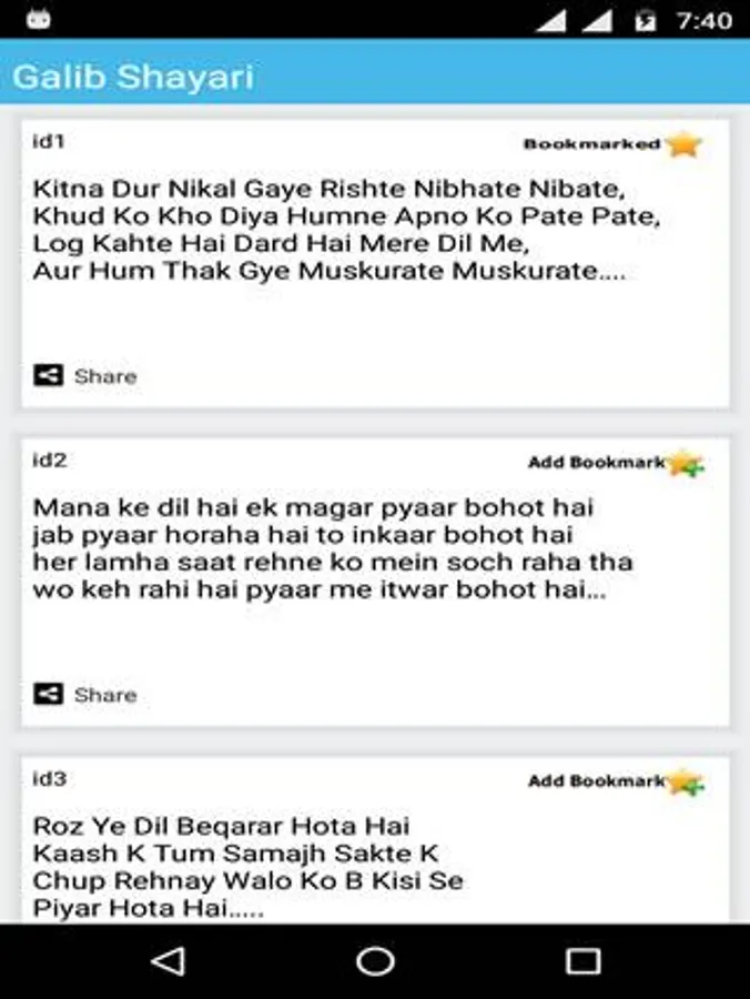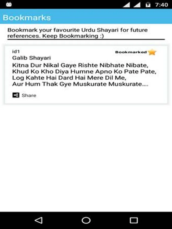 features of the app:- Urdu Shayari in various categories. For quick browsing set bookmark your favorite shayari. Share your shayari with friend using share option. Search shayari using ID & text.
