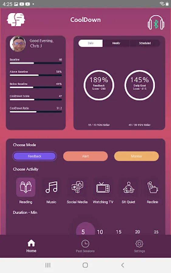 CoolDown helps you build unfocus times into your day with the benefit of neurofeedback. The unfocus network (or default mode network) consumes a lot of brain energy and training this network can help improve creativity, self-awareness, and rest. CoolDown uses neurofeedback to help you learn to quickly enter and maintain longer periods of restful thinking.