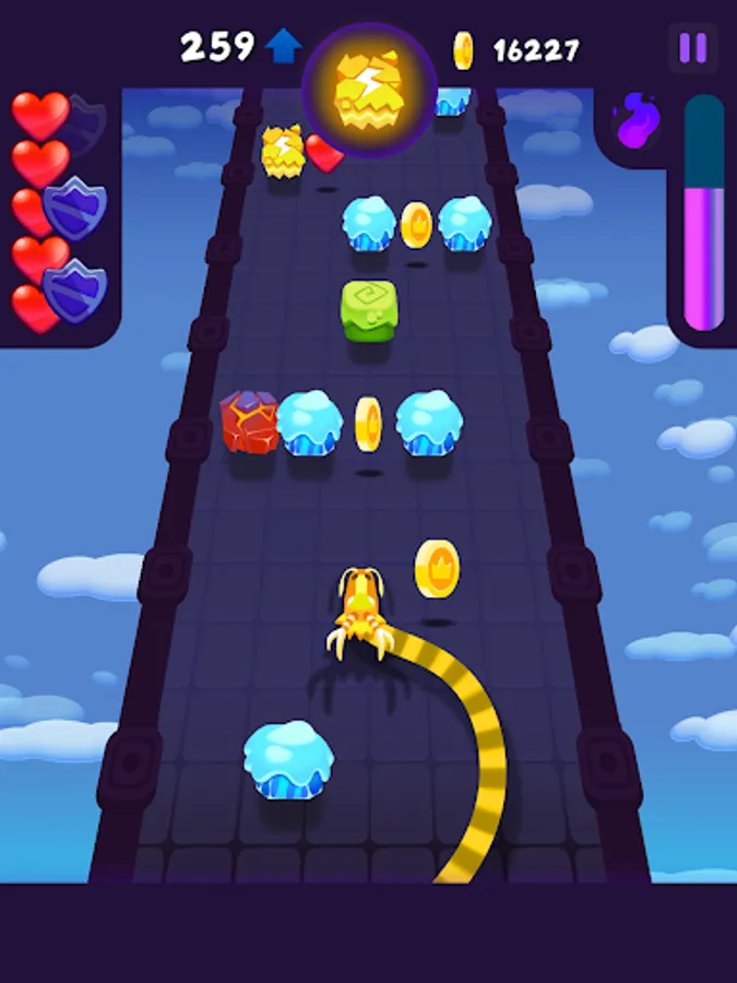 This fun dragon rush offline game has simple mechanics and is easy to play for people of all ages. Slide your finger left or right to control the movement of your dragon and smash blocks of the right color. If you hit blocks that are not your color, you will take damage and your number of lives will drop. Be careful! The dragon will change color along the way. Quickly identifying the colors will help you run further.