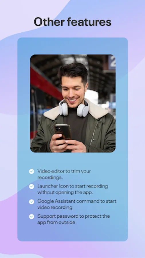 + GOOGLE ASSISTANT : Supports Google assistant for start video recording e.g. "start video recording using Background Video Recorder application".