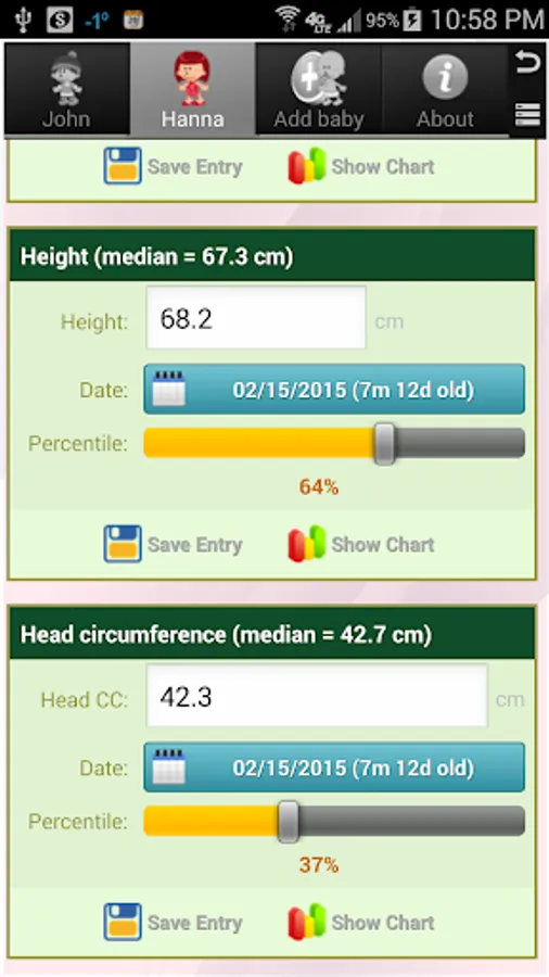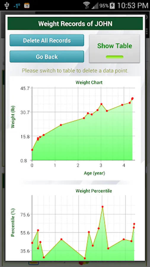 You can add multiple children and save all your data to the database for future review. The saved data can be viewed as tables, or as graphs (values/percentiles vs. ages). It provides you with the median value of weight/height/head CC at your children’s age, and you can get the values at any percentile by easily sliding the percentage bar. So you can compare your children’s growth with that of others, and log your children’s growth history and learn the trend.