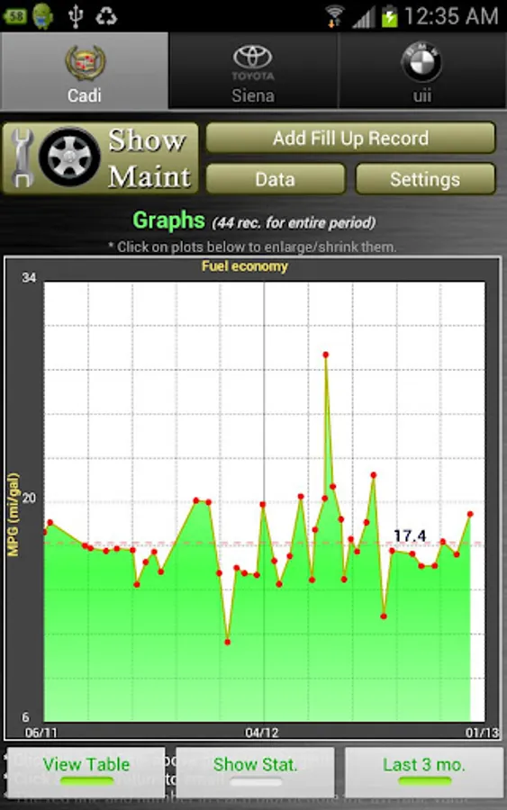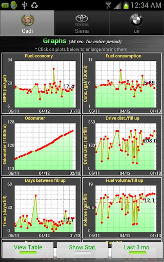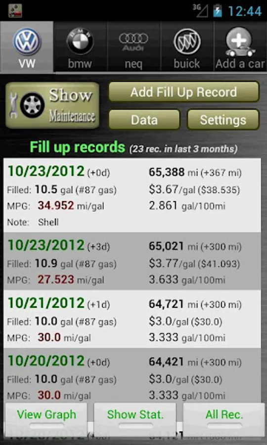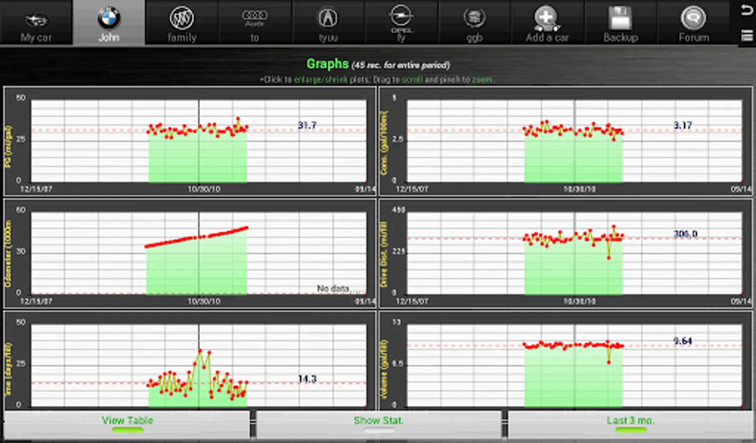 For the fuel logging function, the application automatically generates useful statistics about MPG, gas price, driving distance per day, volume per fill up, cost per day etc. It also provides TEN graphical charts (2.0.1 and up) for detailed and clear reports of your car’s mileage, fuel economy, costs etc.