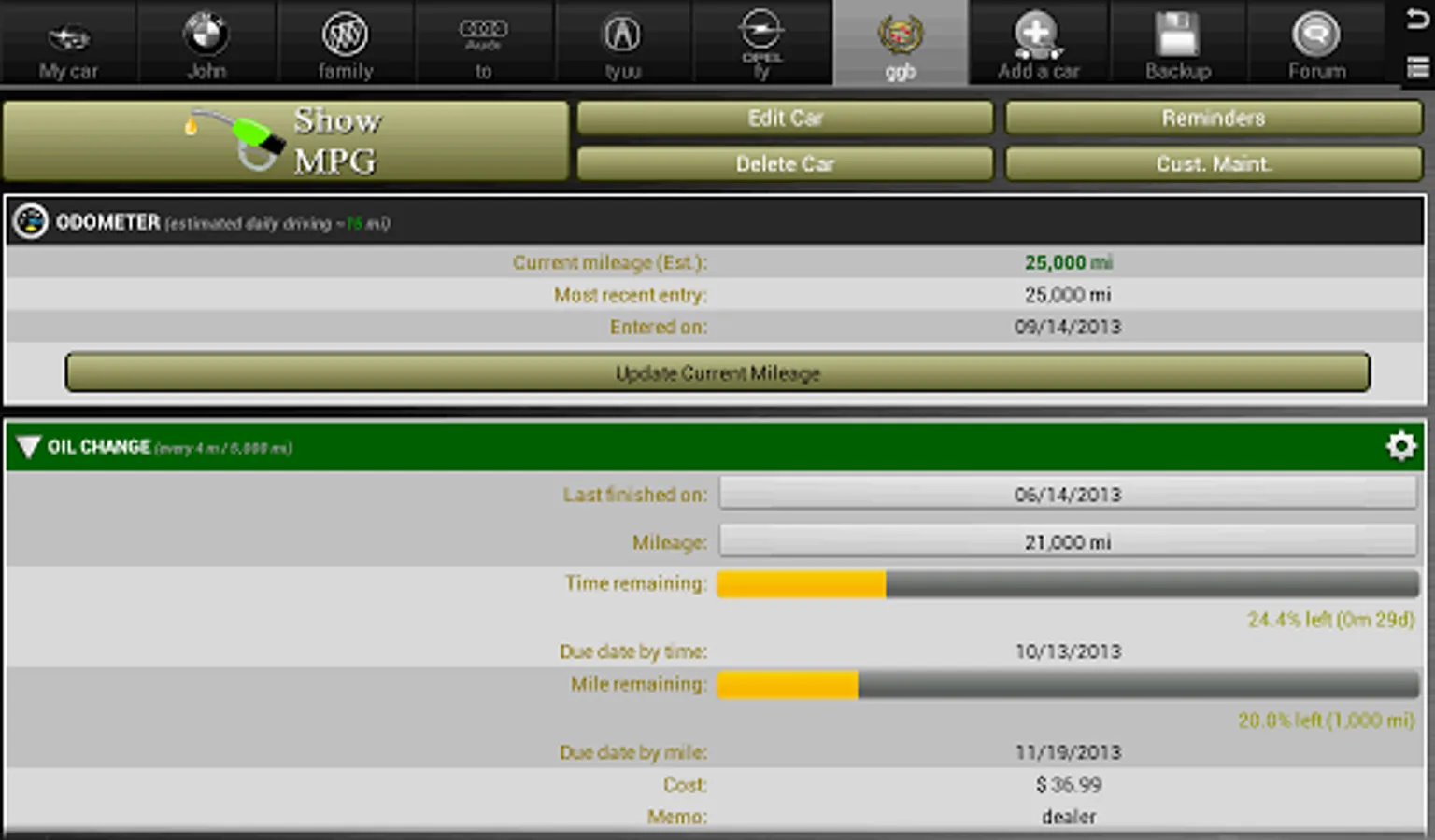 You can manage multiple cars in the application (Pro only), export data to external SD card and restore the saved data. You can also create a CSV report containing all service reminders, full maintenance history and gas fill up records. The app can also email the CSV to your E-mail so that you can open the report from your computer using Excel!