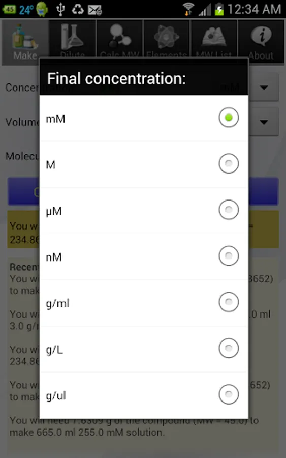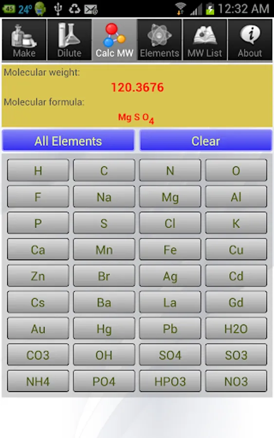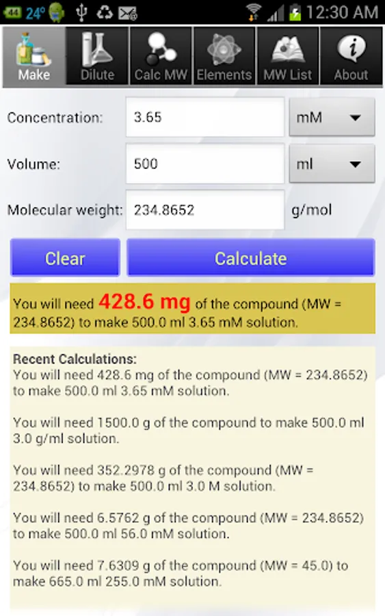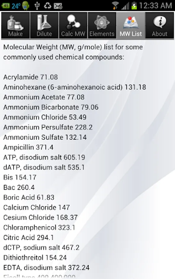 (2) It contains a handy tool to calculate molecular weight (M.W.) of commonly used chemicals in the lab. You do not need to enter the name or molecular formula of the chemical, you just need to press a few buttons to get the MW of the chemical instantaneously.