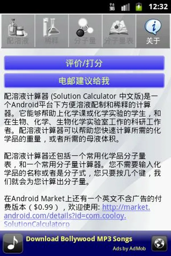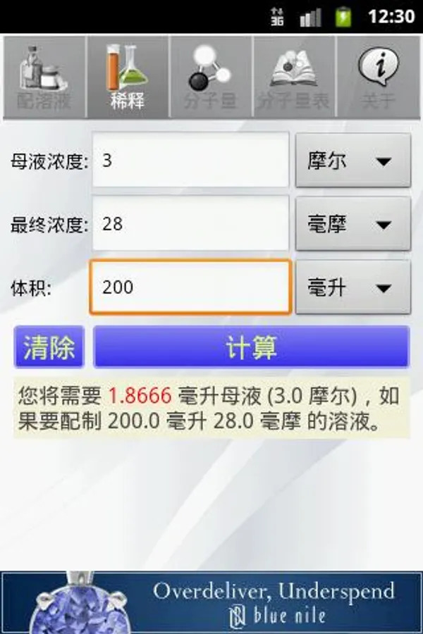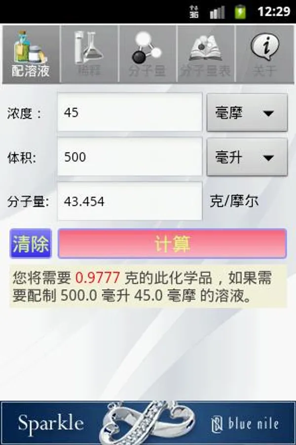 The calculator is convenient for solution preparation and dilution of the solution next Android platform calculator. It can help or chemical chemistry class experiment students, and working in biology, chemistry, biochemistry laboratory researchers. Calculator can help you with a solution quickly calculate the weight of the chemicals needed or desired volume of mother liquor.