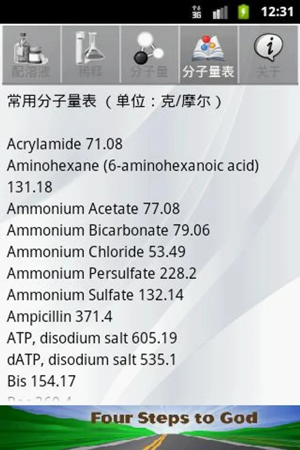 Solution with a calculator further comprises common chemicals tables molecular weight, molecular weight, and a common calculator. You do not need to enter the name or chemical formula, you just press a few keys, we'll show you calculate molecular weight.