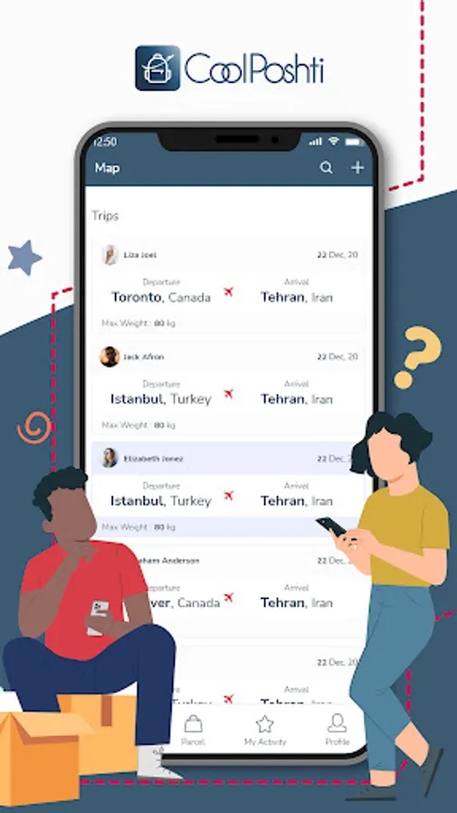 CoolPoshti is an online platform connecting people who are traveling to the people that trying to send their small packages to a different city or country by a passenger in order to save time and cost. CoolPoshti charges both Sender and Traveler a fee to connect them together and the rest of the process is happening between the other two parties.