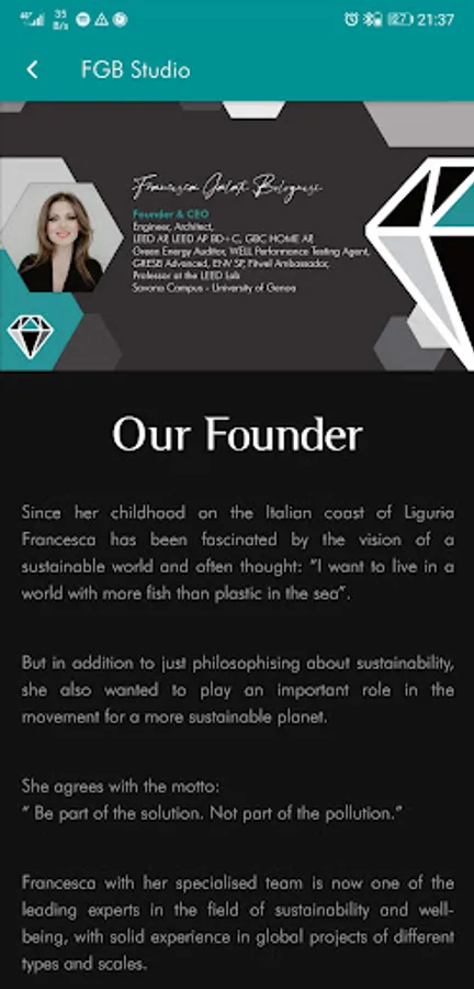 FGB studio Future Green Building studio is a highly specialised international consulting firm that deals with sustainability and well-being. Thanks to a team of global specialists, FGB studio is able to set up and supervise projects with the same high quality all over the world.