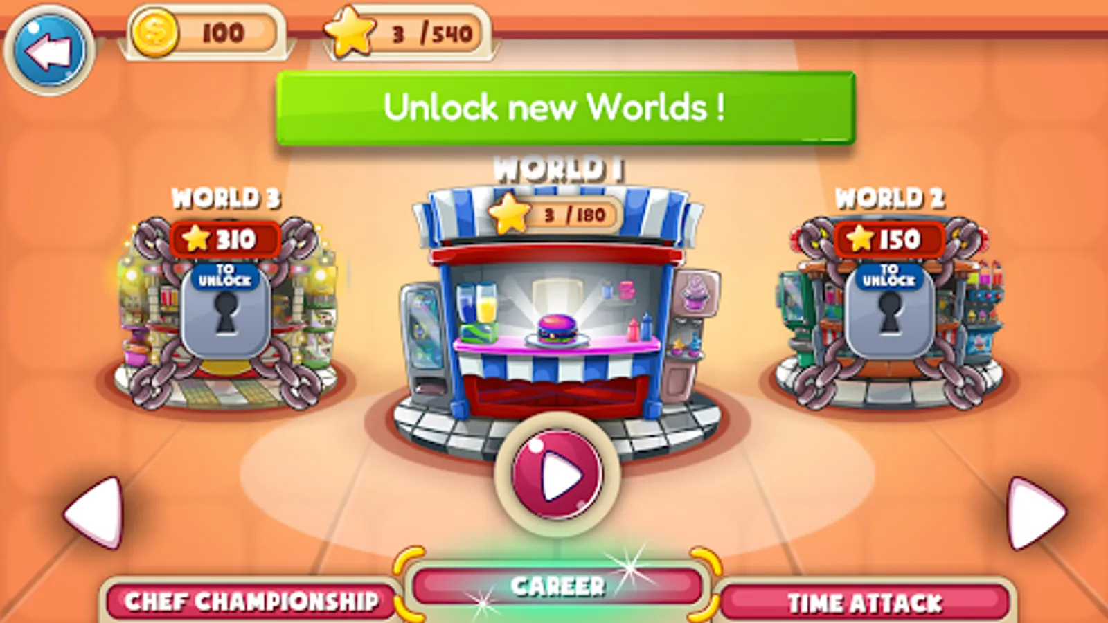 Dash from restaurant to restaurant on this magical map. You will discover and unlock many places as you progress on your journey. Get the restaurants back to business and attract more and more customers. Let the Cooking Madness begin!