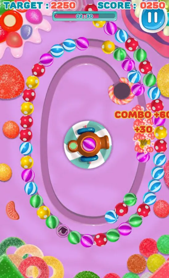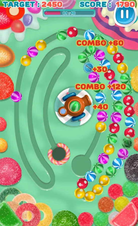1. When three or more candy balls of the same color match together, they are cleared from the playfield.