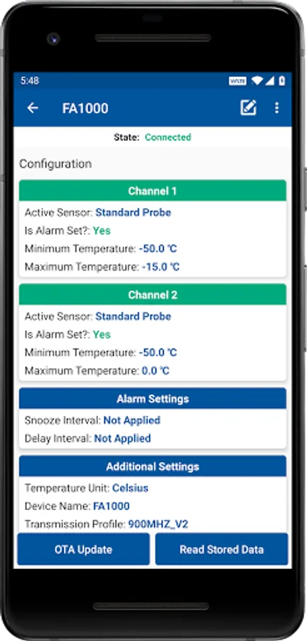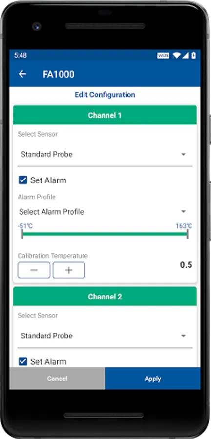 User can configure the device with one of two different probe types Standard Probe or Lab/Cryogenic RTD for freezer or refrigerator monitoring or set up a custom profile for other applications. Only Admin users will have an option to alter important device configuration from app.