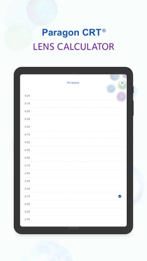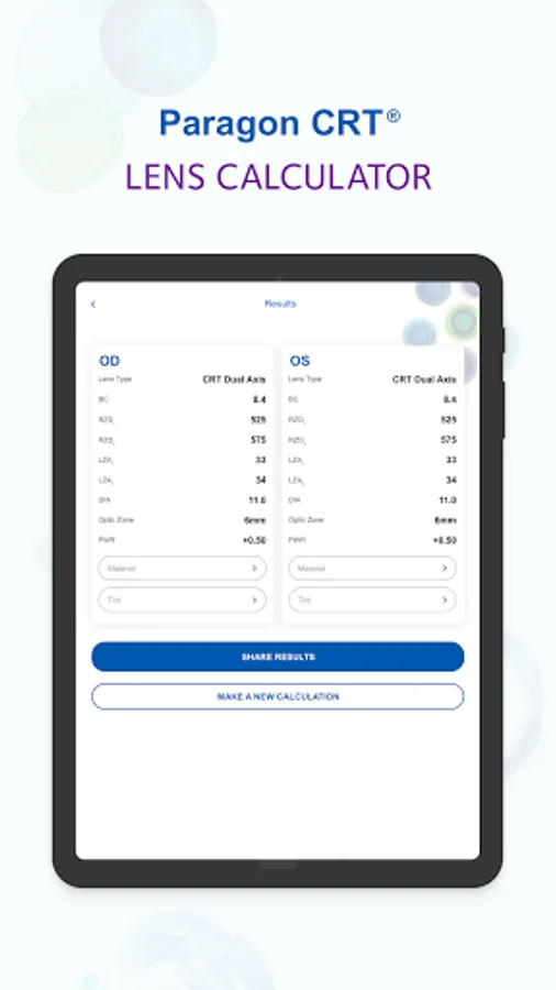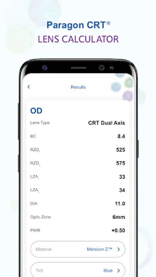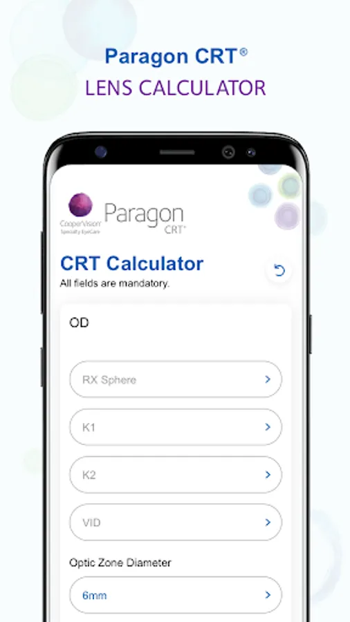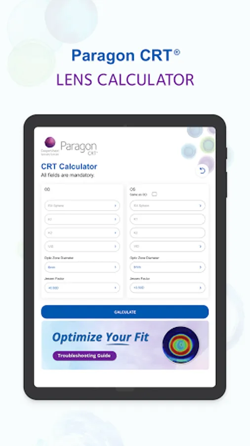 Additional benefits of the Paragon CRT® Calculator include the ability to share results of the calculated prescriptions and to contact CooperVision SEC with any questions or concerns you have with the education link inside the calculator. The Paragon CRT® Lens Calculator is an educational lens fitting tool intended for professional eye care provider use. Only licensed eye care providers may place Paragon CRT lens orders. Eye care professionals may choose to use the app as part of their patient evaluation. The Paragon CRT® Lens Calculator is not intended as and does not constitute medical or optometric advice and eye care professionals should rely on their own expertise.