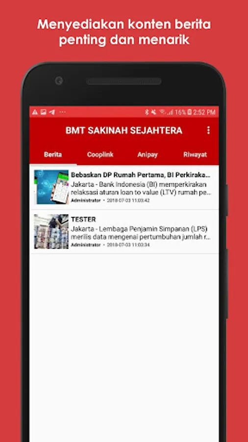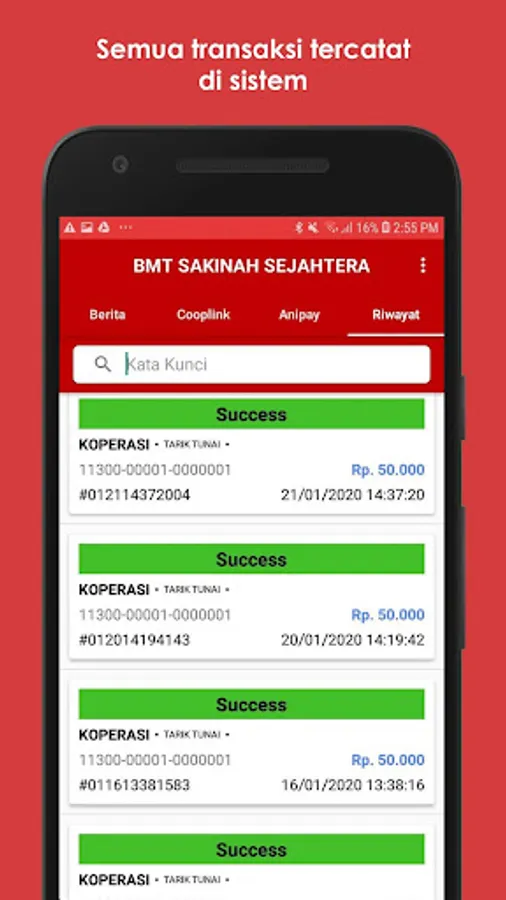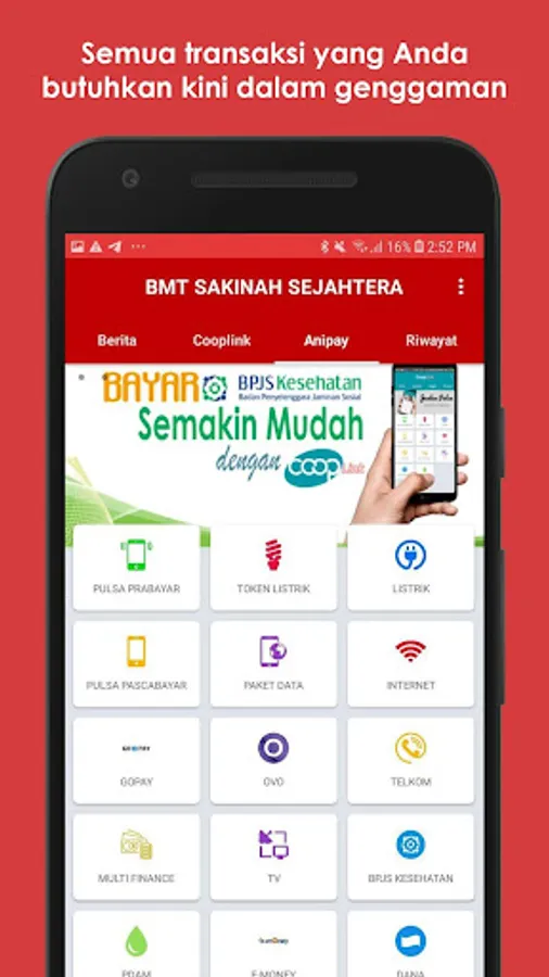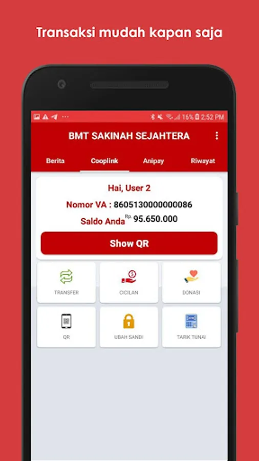 BMT SAKINAH SEJAHTERA mempersembahkan kemudahan berbagai transaksi finansial untuk semua Anggota. Aplikasi Cooplink BMT SAKINAH SEJAHTERA ini dapat digunakan secara online setiap waktu anda ingin melakukan transaksi finansial tanpa perlu ke kantor layanan. Kenyamanan bertransaksi finansial kini ada dalam genggaman anda (Tidak perlu membawa uang tunai).