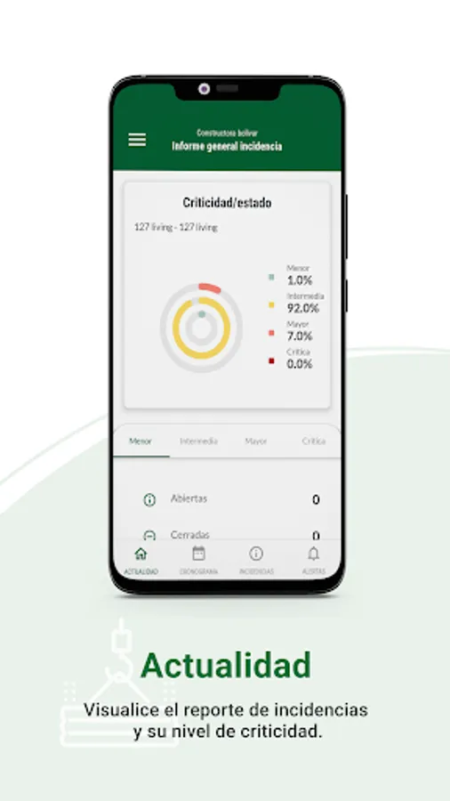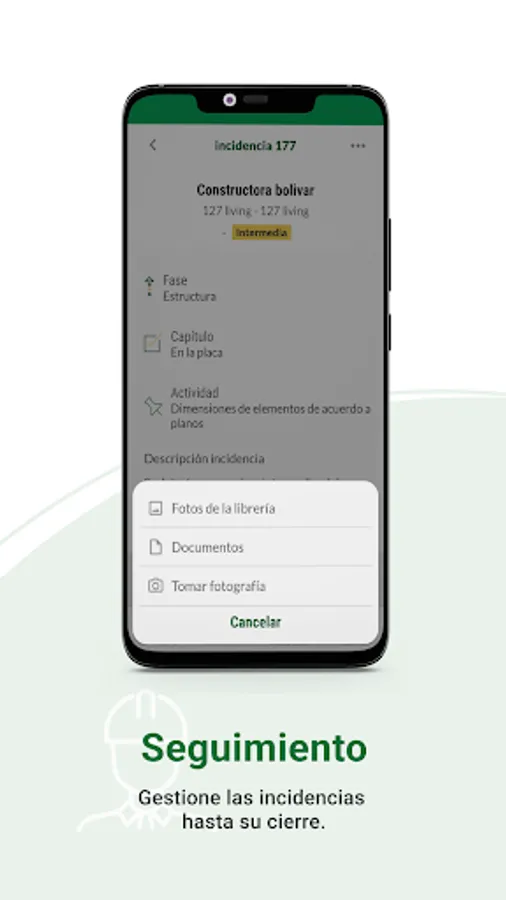 From the Obra al día app you can monitor the quality of the construction process in projects covered by Seguros Bolívar. Our app allows you to track the works by recording and storing data such as incidents and technical supervision reports, and fill out the form for the issuance of Technical Certificates of Occupation (CTO).