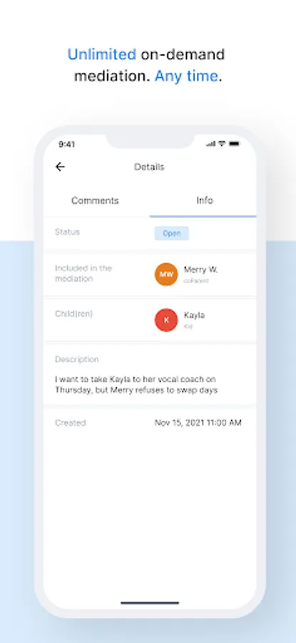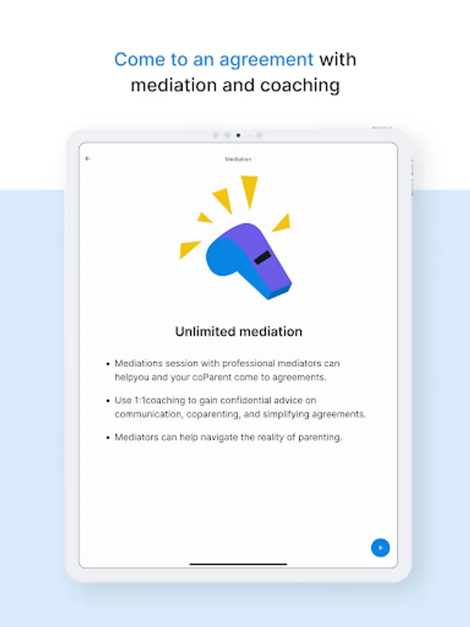 - Connect with a live, qualified, coParenter Mediator who can help you and your coParent reach agreements.