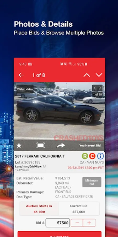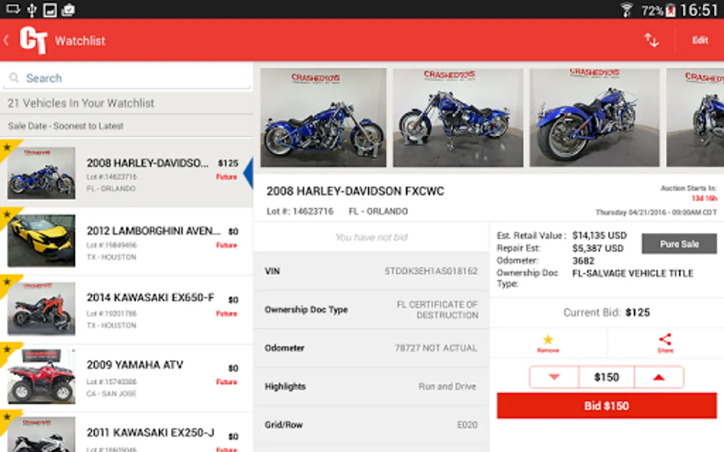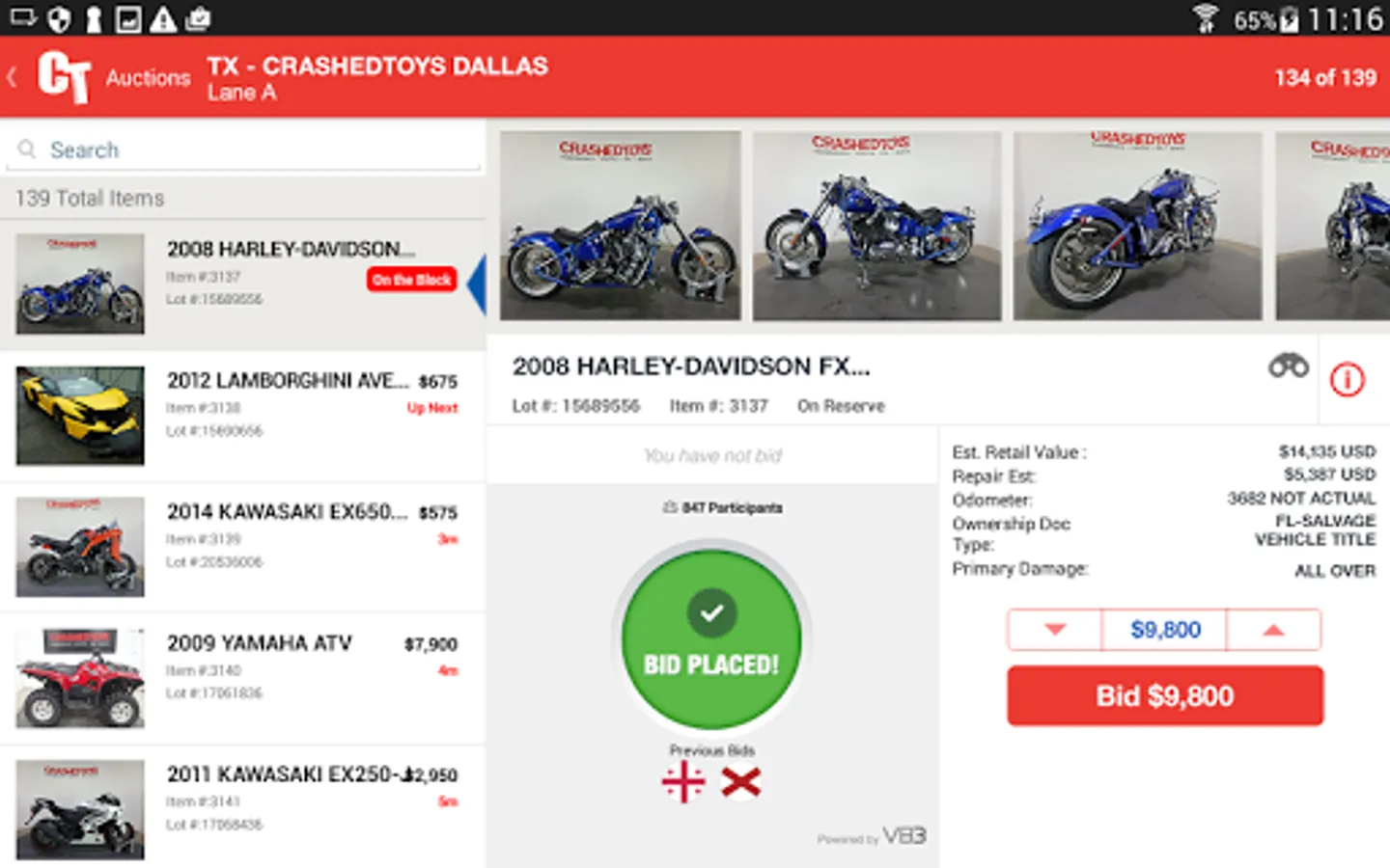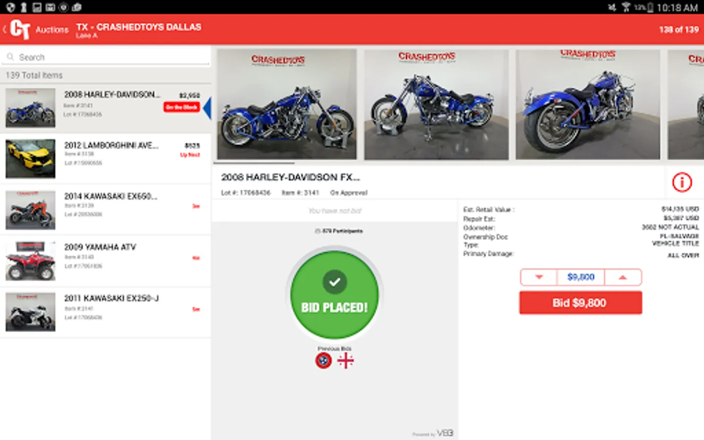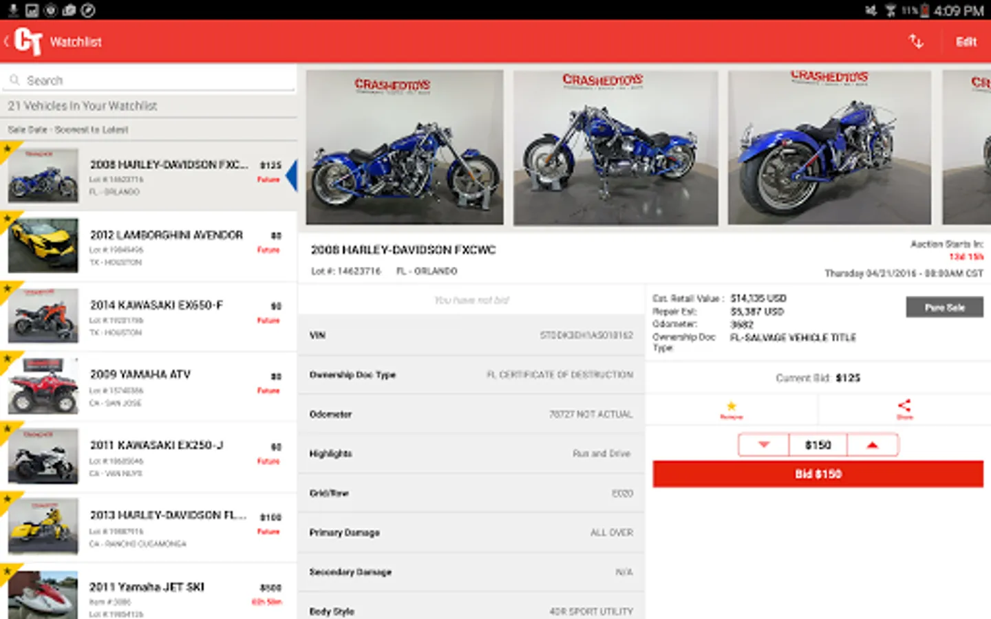 The CrashedToys App allows you to bid on and buy motorcycles and powersports vehicles from anywhere. Find motorcycles and other vehicles by type, year, make, model and location. Get notified about the results of your auctions and stay informed about the motorcycles and other vehicles on your Watchlist. Not a CrashedToys Member? Register for FREE with the CrashedToys App. The CrashedToys App lets you participate in online powersports auctions hassle-free!
