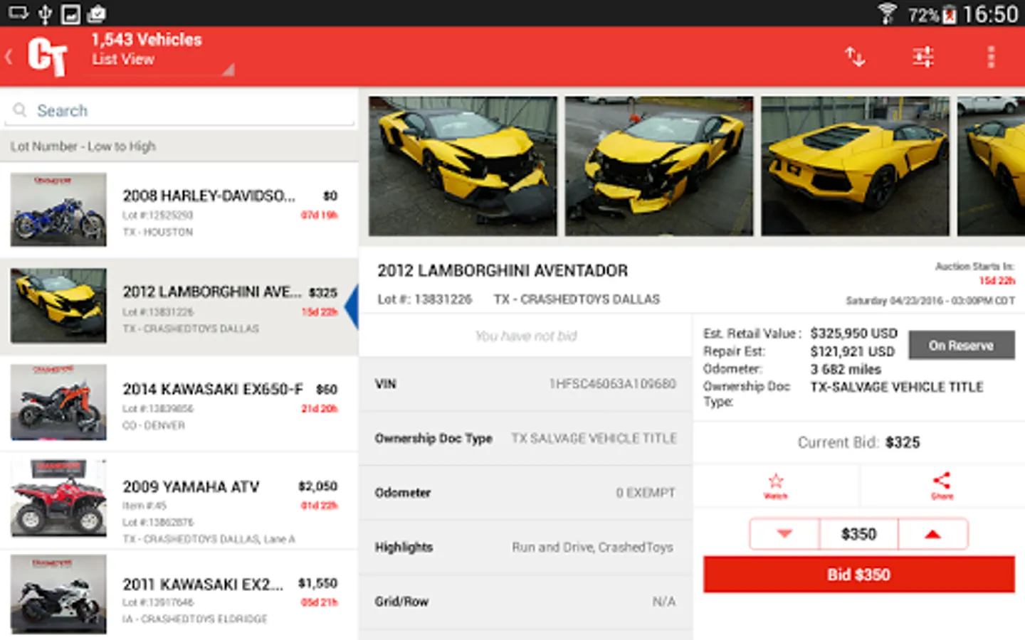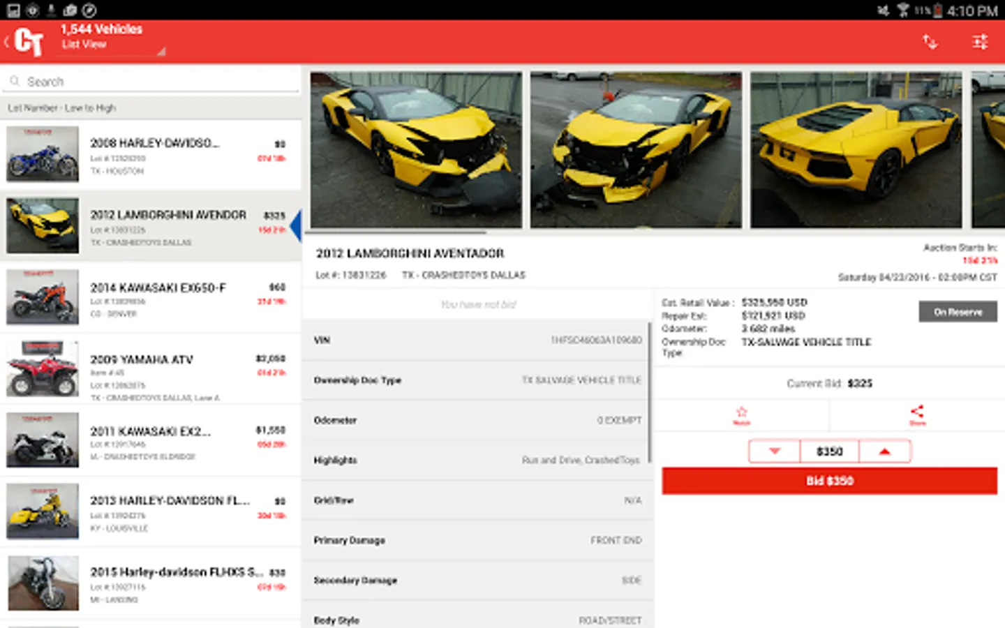 Search, bid and buy all the best brands in salvage and clean title Motorcycles, ATVs, UTVs, snowmobiles, exotic cars, boats and RVs with the CrashedToys App. CrashedToys also features online powersports auctions every month