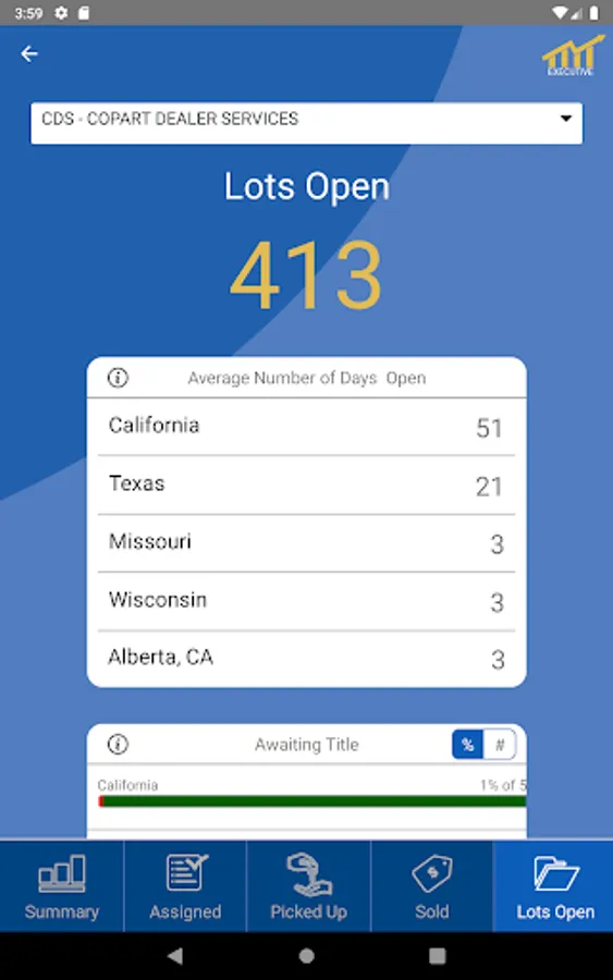 The Executive section keeps our Seller Executives up to date with various key points and values of lots assigned to Copart, using beautiful visualizations and graphs. It is a tool that will help you stay on top of your growth, engagement, and business with Copart, on-the-go.