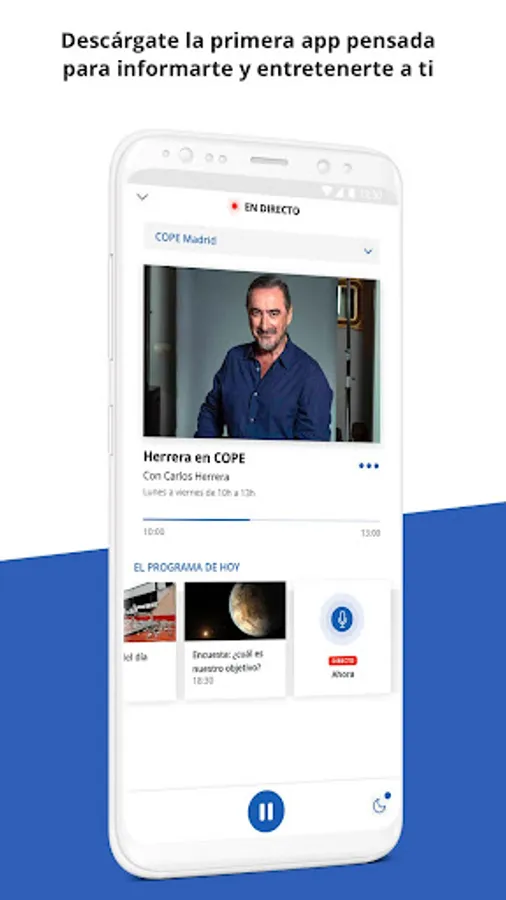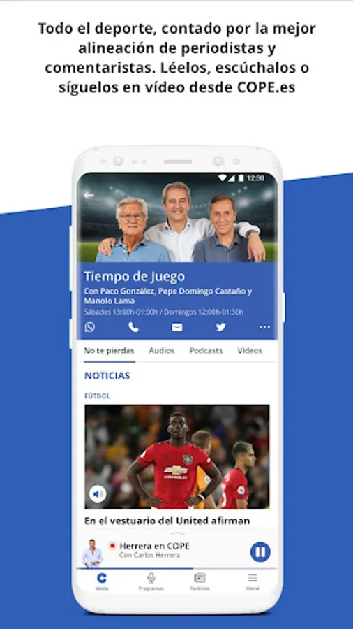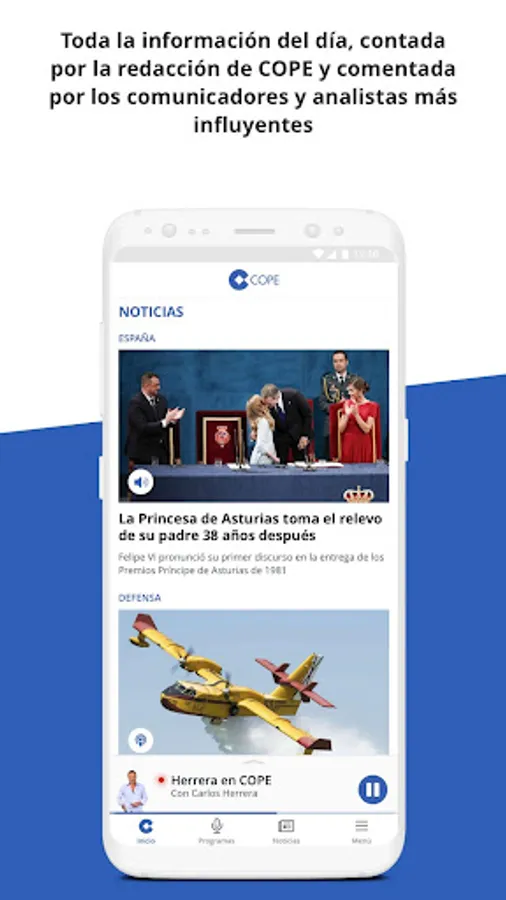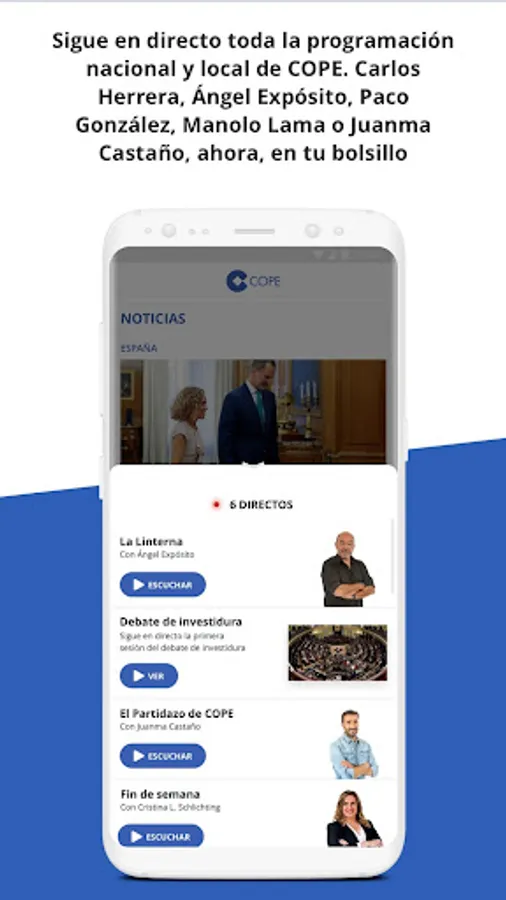 The most growing programs of Spanish radio are in COPE. 'Herrera en COPE' takes the pulse of current events from Monday to Friday from 6:00 am to 1:00 pm with the analysis of prestigious experts such as Bieito Rubido, David Gistau, Santiago González, Salvador Sostres and Ignacio Camacho. At 1:00 pm, the informative 'Mediodía COPE' tells you what is happening from your closest and human perspective. The stories with name and surname, with personality and clarity, are told by Pilar Cisneros and Fernando de Haro in 'La Tarde', from 3:30 to 7:00 p.m. Then, 'The Lantern' looks closely and almost with a magnifying glass the day, to finish it with all the keys: news, opinion, reflection. Hand in hand, the voice and committed journalism of Ángel Expósito. The best team in Spanish sport also plays in COPE. Listen to the online matches of the Spanish league, Copa, UEFA Europa League, Champions League and the Spanish national team. He is captained by Paco González, Manolo Lama, Pepe Domingo Castaño and Juanma Castaño. Every night and the full afternoon of Saturdays and Sundays, in 'Game Time' and 'The great game'. On the weekend mornings, Cristina López Schlichting waits for you from 10 a.m. to spend the morning in the best company, whether you are looking for information or having fun.
