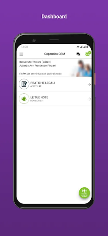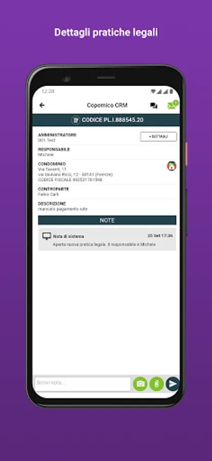 Copernico CRM is a WEB platform that simplifies the lawyer's work and speeds up the interaction processes with the Administration Office. You will be able to communicate directly with the studio by entering notes. You can attach files and photos in order to speed up and streamline communications relating to legal practices. A balanced mix of design and functionality guarantees a simple usability of the APP. By staying connected, you can log in at any time and receive pop-ups in real time that will warn you if new notes have been entered.