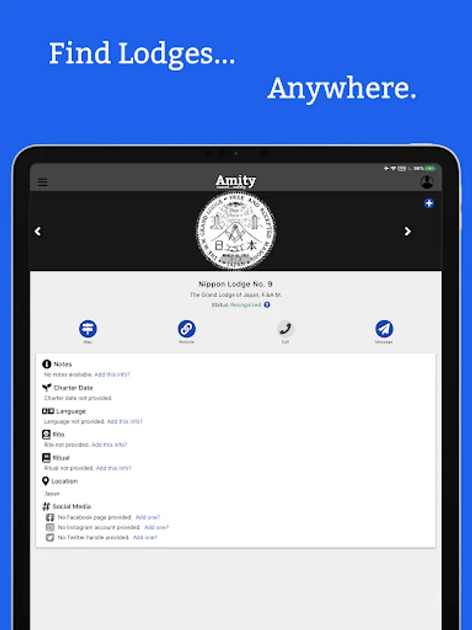 Welcome to the rest of the world. Amity is the only app that brings a truly global experience to the world's oldest fraternity. Today's Freemasons expect a connected Craft, and Amity delivers with over 300 Grand Lodges and over 45,000 Lodges at your fingertips.