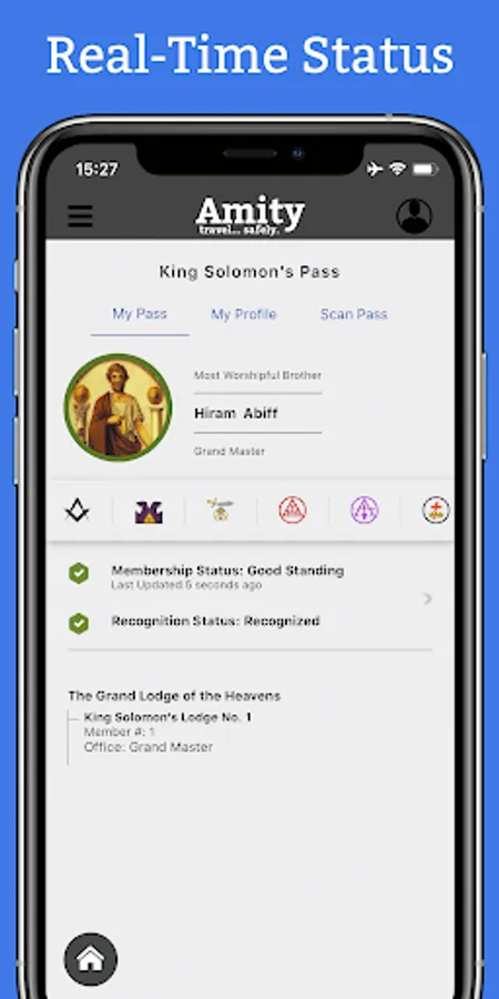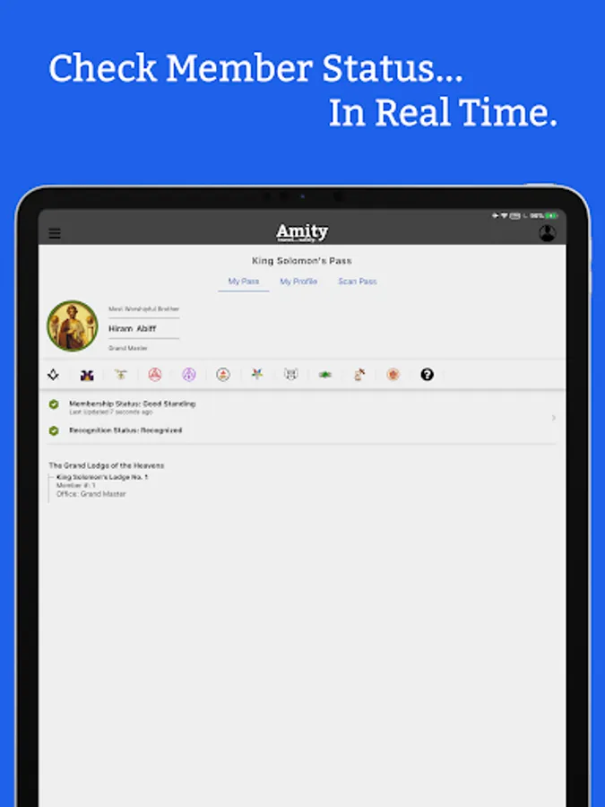 Amity launched the first global, real-time status checker in 2018, and King Solomon's Pass is still the standard in Grand Lodges around the world. Now, in Amity v3, it's built right into the app! You can: