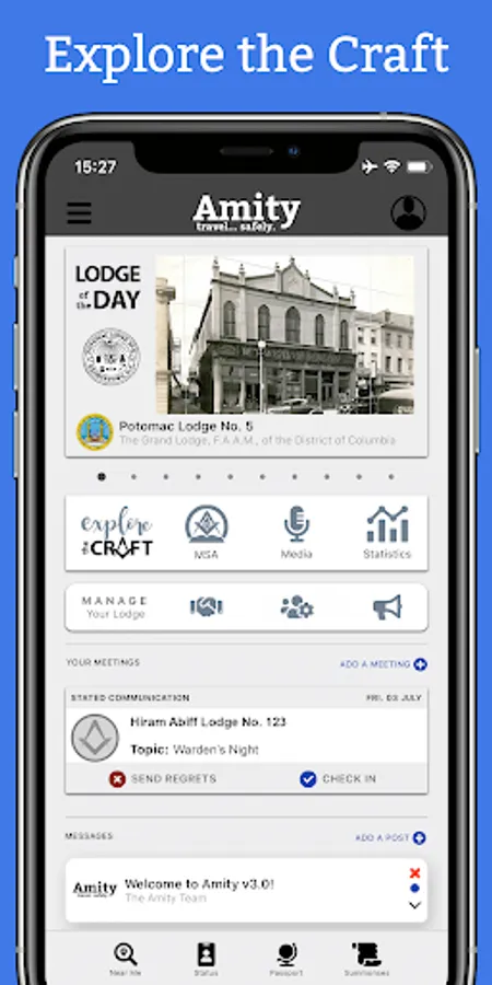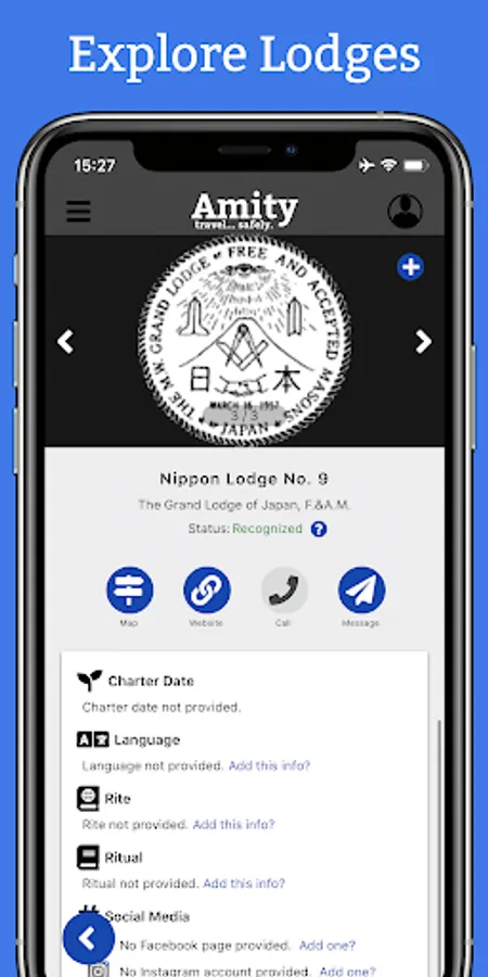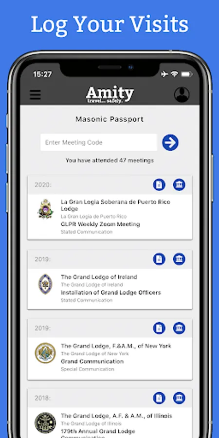 Amity's Masonic Passport lets you keep a record of your visits to any Lodge in the world. For each entry you can take notes to remind yourself of what happened, or launch the Lodge's profile to get more information. New in Amity v3: scan your Lodge's QR code to launch its profile and check in with just one tap!