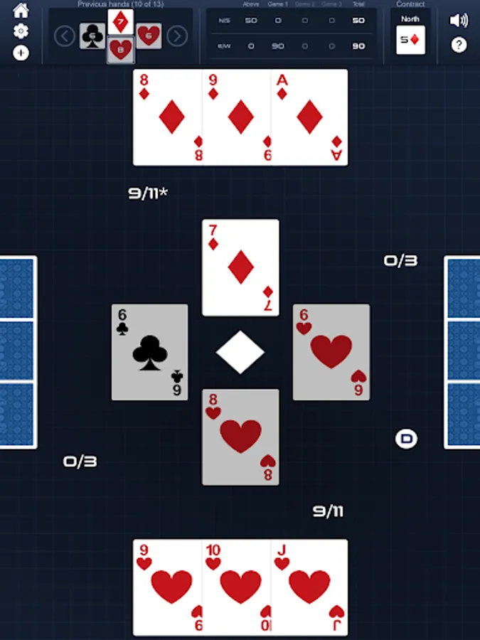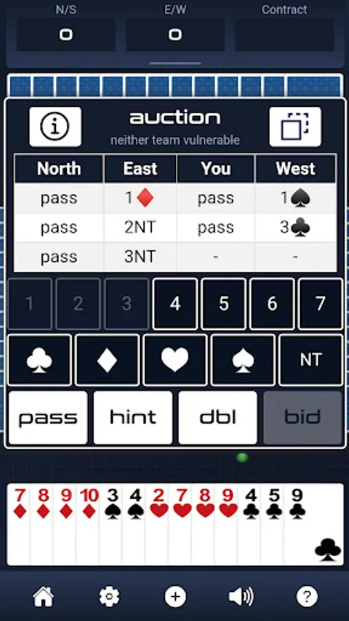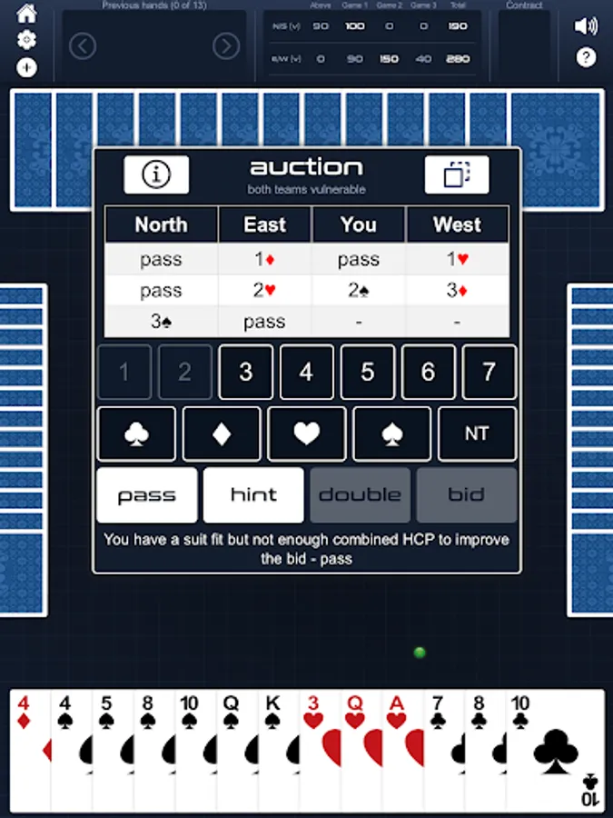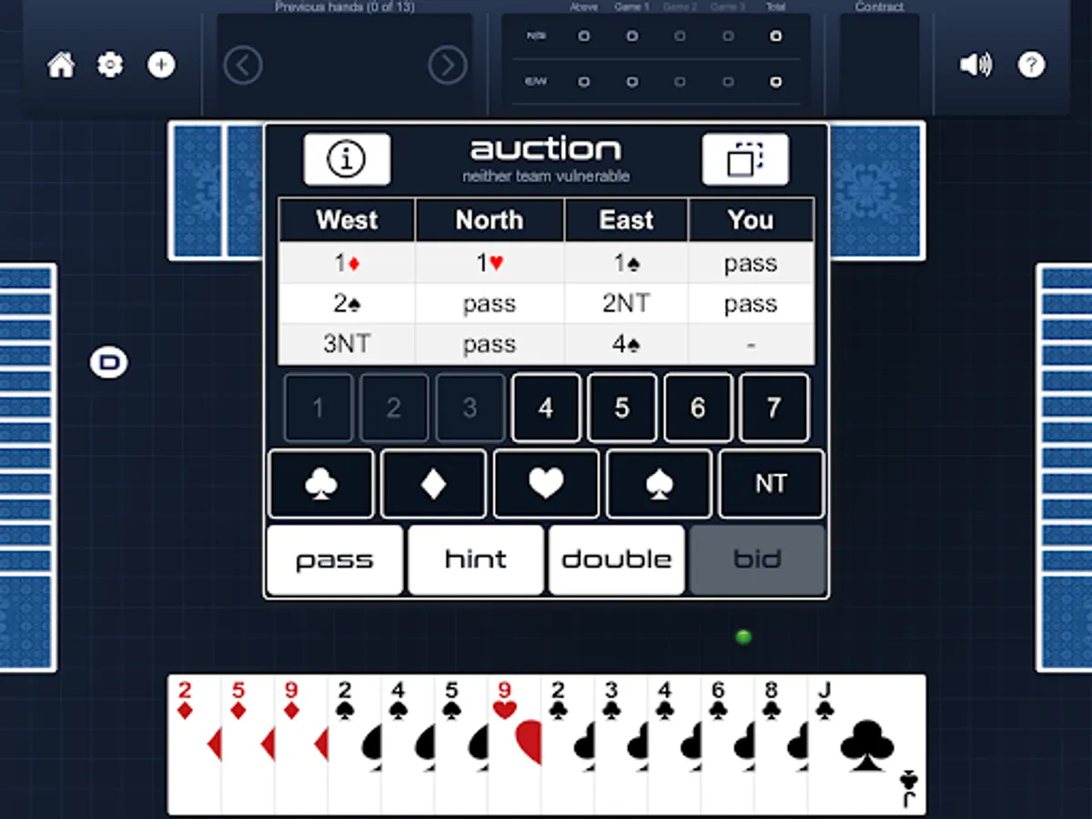 This game uses the Standard American bidding system. Hints can be provided during the bidding if you request them to keep your learning on track.