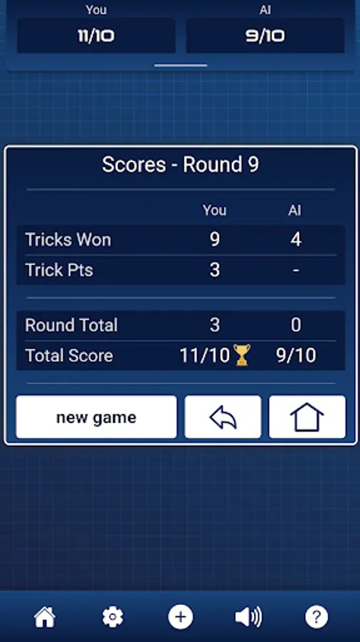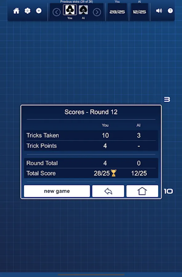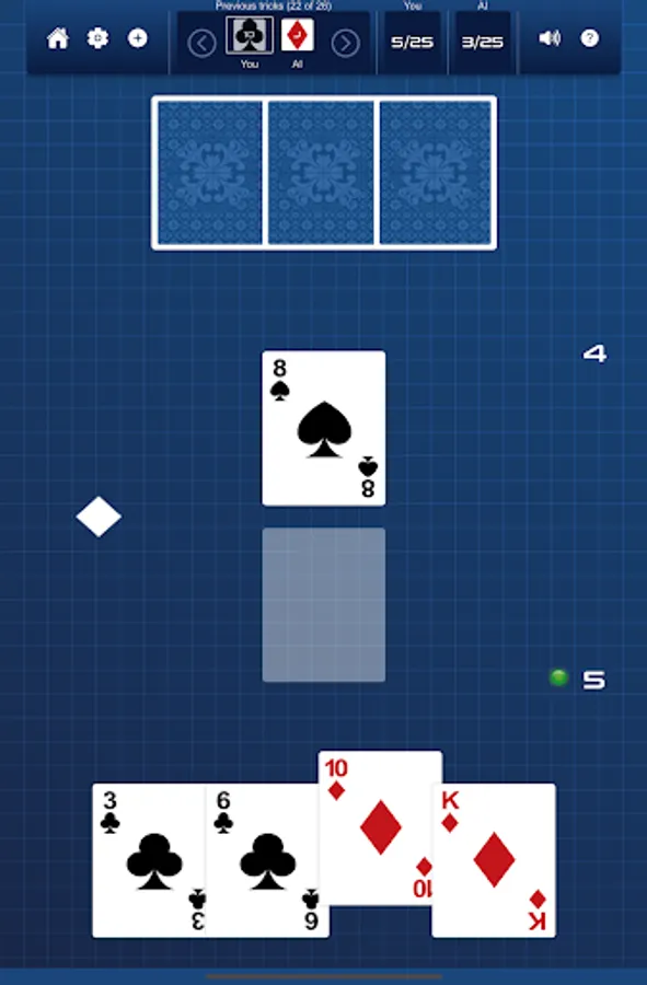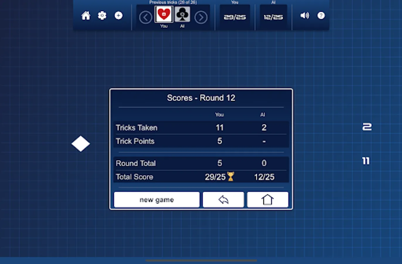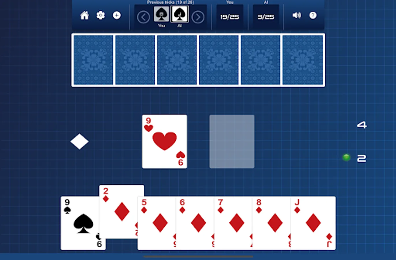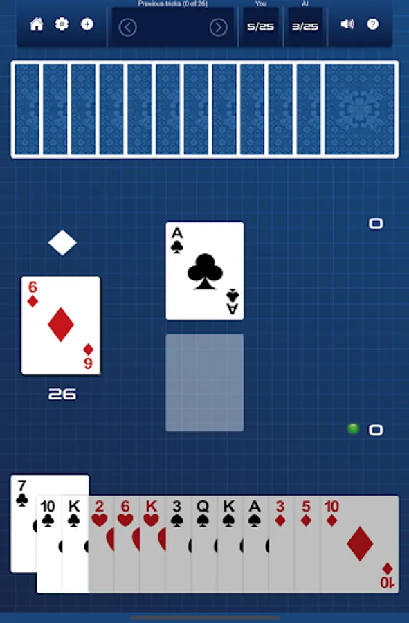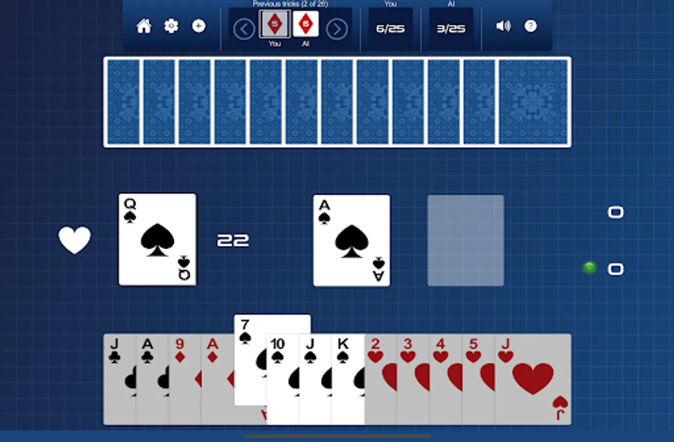 The aim of the game is to take more tricks than your opponent. The winner is the first player to reach the win target, either 10, 25 or 50 points. Make sure to track your all time and session stats to follow your improvement as you learn!