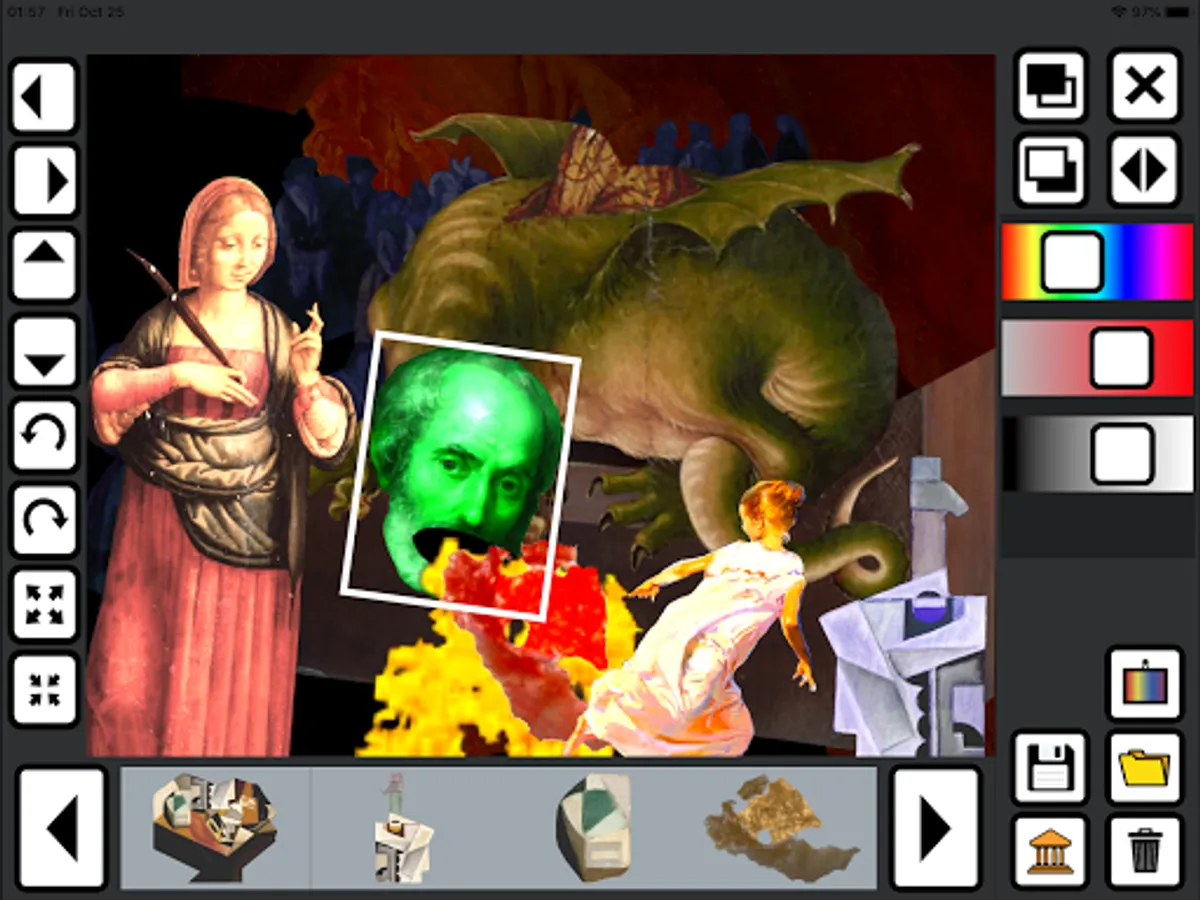 The game is like a puzzle or a collage. You can choose the pieces you want to add to your composition, move them, rotate them, change the size or their colors. There are no rules or restrictions, you can do it as you want and express your creativity.