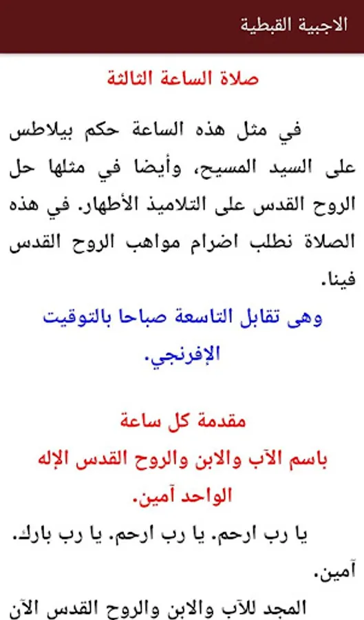 The third hour prayers be offered at nine am, it means this prayer to remind us of three major events: the trial of the Lord Jesus by Pontius Pilate, and the ascension of Christ to the heavens, and the solutions of the Holy Spirit cleanse our hearts and renew our lives.