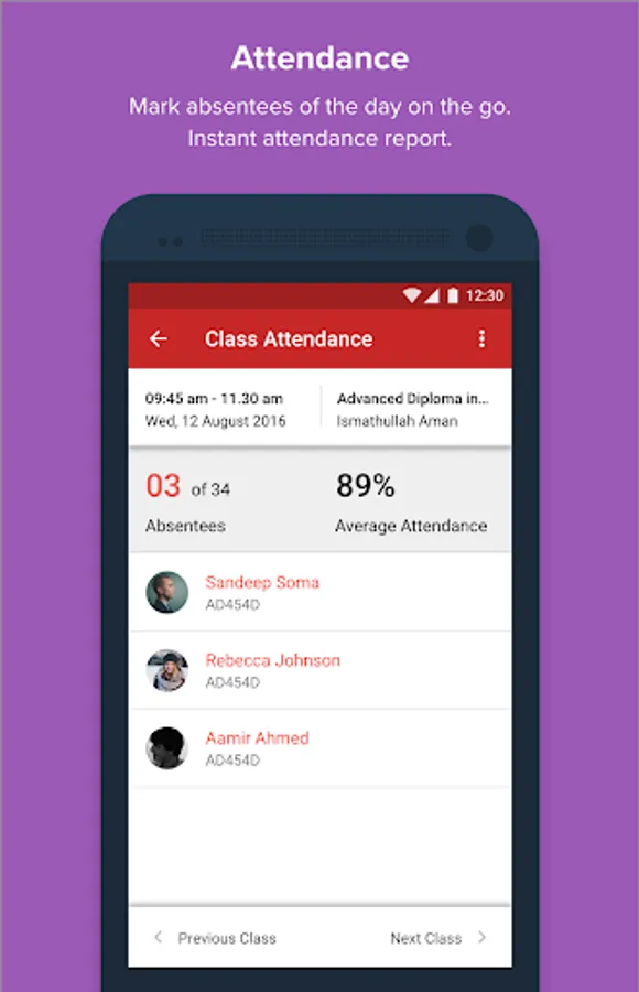 Mark Attendance: Teachers can mark the attendance right from classroom using mobile app, it is easier than ever to mark the absentees and access the attendance report of a class, also same time SMS will reach out to parents as their kid is absent for the day or period.