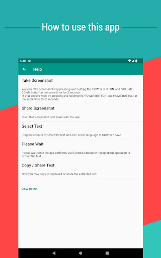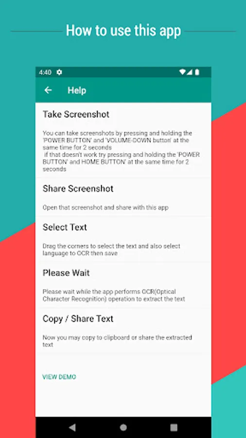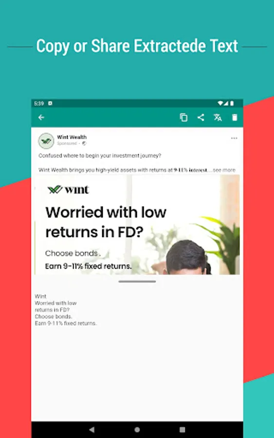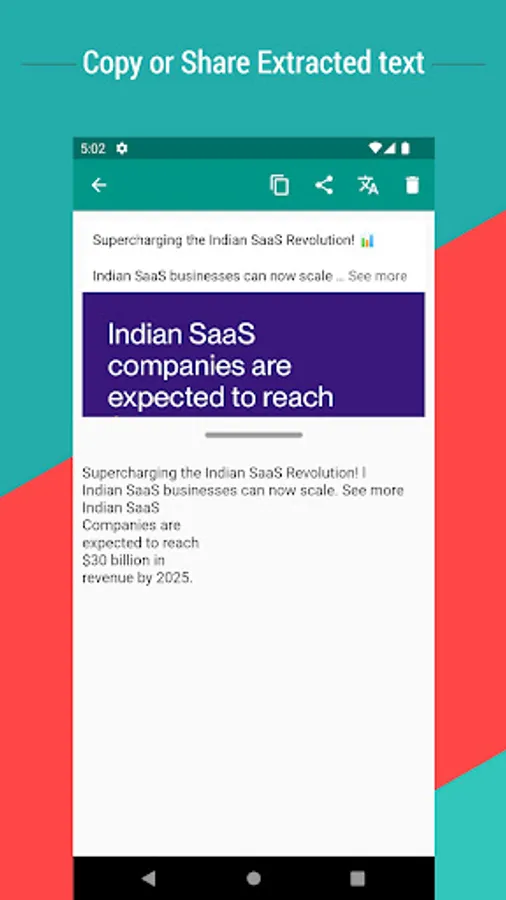 Default long press to copy text on mobile screen not works sometimes there this app helps you to extract text/words from mobile screen by just sharing your screenshot with this app.