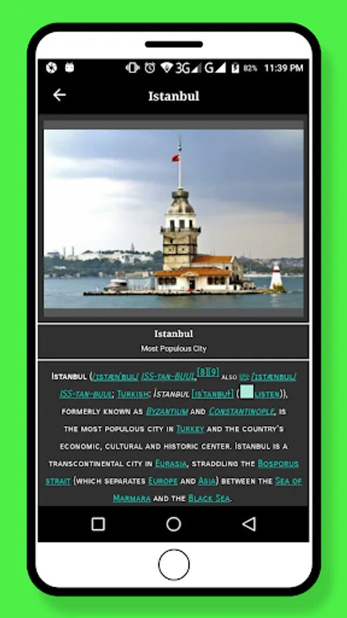 Istanbul Android Apps is provide you Istanbul's History, Geography, Cityscape, Administration, Demographics, Politics, Economy, Culture, Sports etc.
