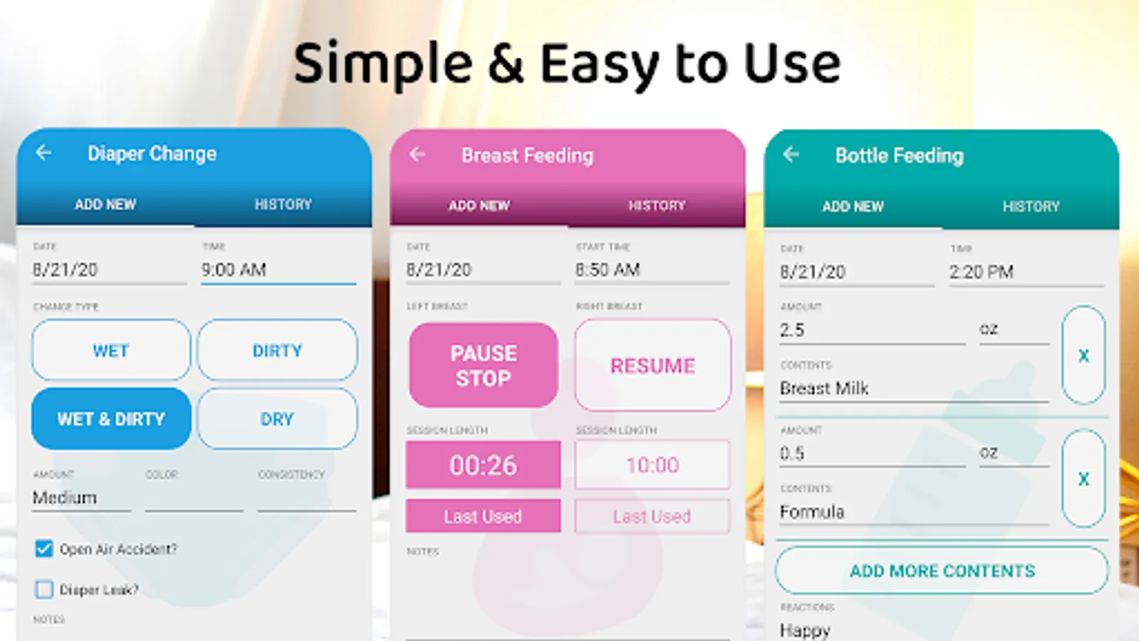 Baby Feeding Tracker: Breastfeeding, Breastfeeding Interruption, Breastfeeding active timers, Bottle Feeding - multiple content tracker with breast milk and formula, Solid Food Feeding, Diaper Change.