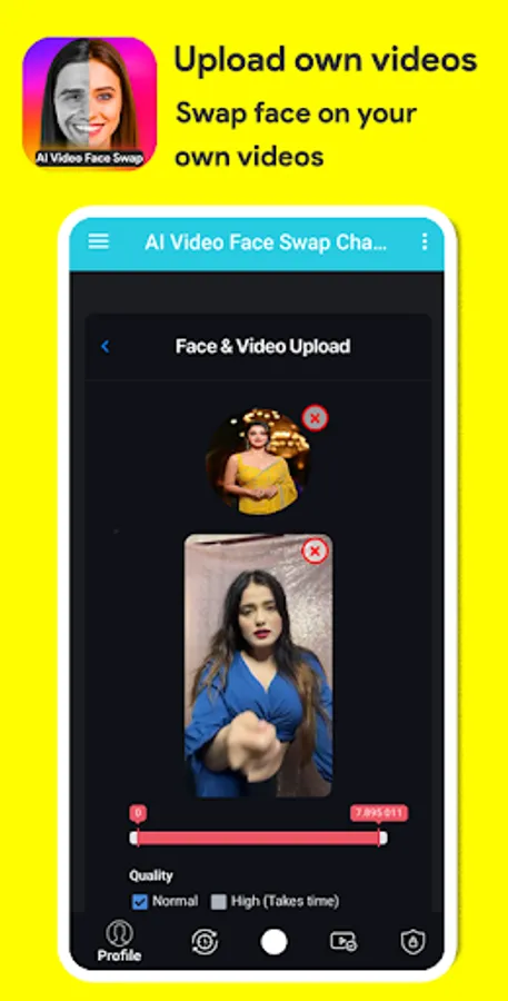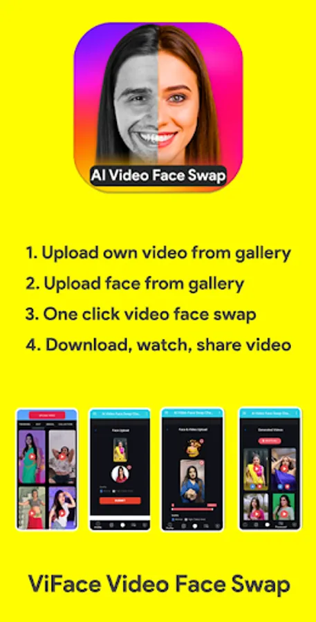 This app uses state of the art Artificial Intelligence to swap a face in any video with your face. You just have to upload a video and your selfie photo and ViFace AI Video Face Swap will change the face in the video to your face.