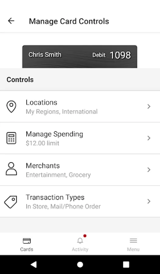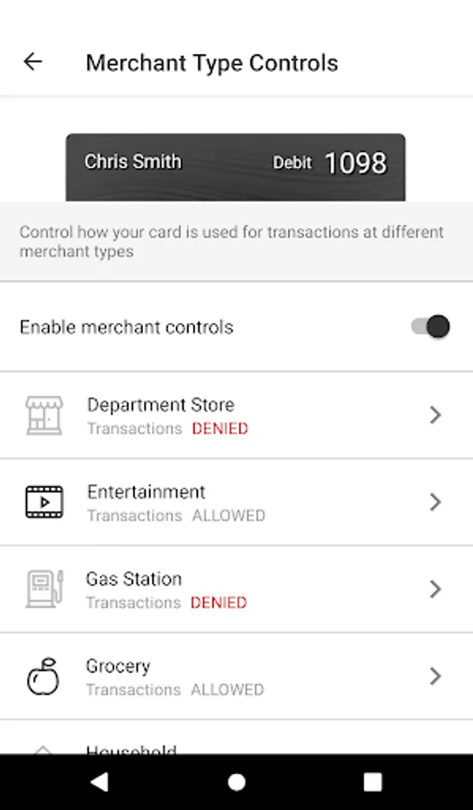 Spending limits can be established to allow transactions up to a certain dollar value and decline transactions when amounts exceed your defined thresholds. Transactions can be monitored and managed for specific merchant categories such as gas stations, department stores, restaurants entertainment, travel, and groceries. And your transactions can also be monitored for specific transaction types: in-store purchases, e-commerce transactions, mail/phone orders and ATM transactions.