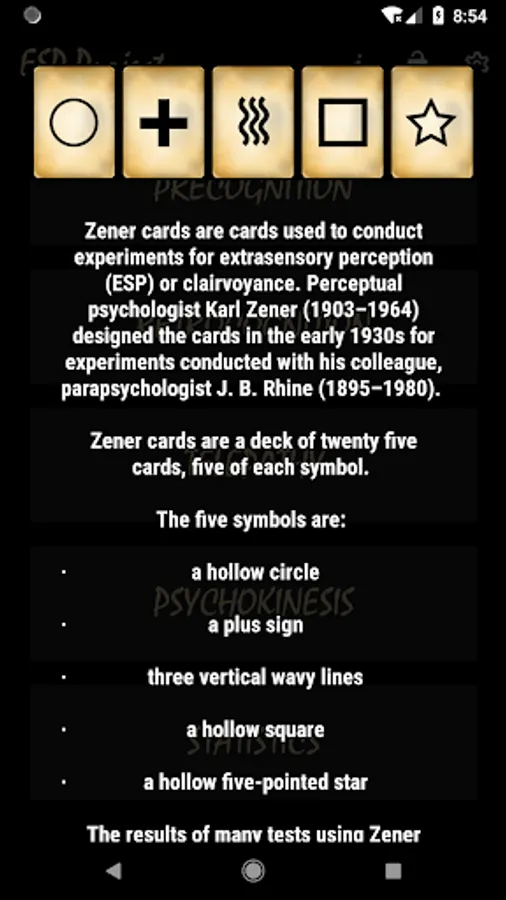 This app has been developed to reliably test various types of ESP using the well established Zener Cards method.