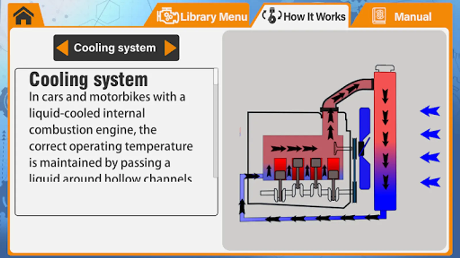 Use your finger to rotate the images and animations on your smartphone to explore and learn about the various parts and functions of the engine. The glossary of engine parts includes an image of each, as well as a full written description.